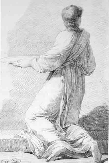 (fig.1) J.-B. Suvée, Jeune lévite drapé, étude de figure pour La Présentation de Jésus au temple, 1775, pierre noire, H. 468 mm ; L. 310 mm, inscription au verso, en bas, à droite : Suvée à Rome Orléans, musée des Beaux-Arts.