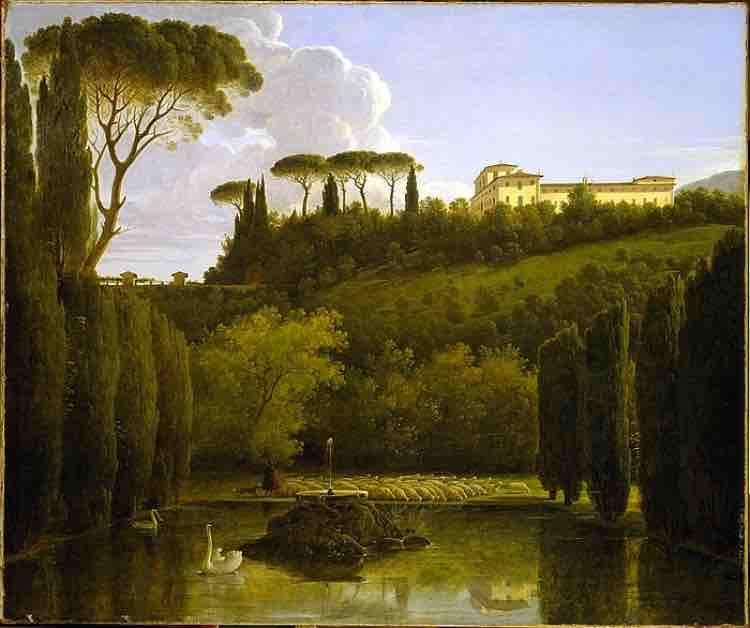 Comme la majorité du cercle artistique expatrié de Rome, Chauvin est attiré par l'atmosphère des paysages vallonnés des campagnes italiennes. Il doit à Valenciennes sa maîtrise de la lumière chaude et méditerranéenne et de la perspective atmosphérique, accentuée ici par l'échelle décroissante des pins qui entourent la Villa (fig.1). Chauvin apporte une nouvelle sensibilité aux paysages, toute poétique, voire lyrique, se traduisant par un naturalisme exacerbé et une grande attention portée à la lumière naturelle et aux manifestations atmosphériques, qui influenceront bientôt les vues de plein air de Camille Corot.