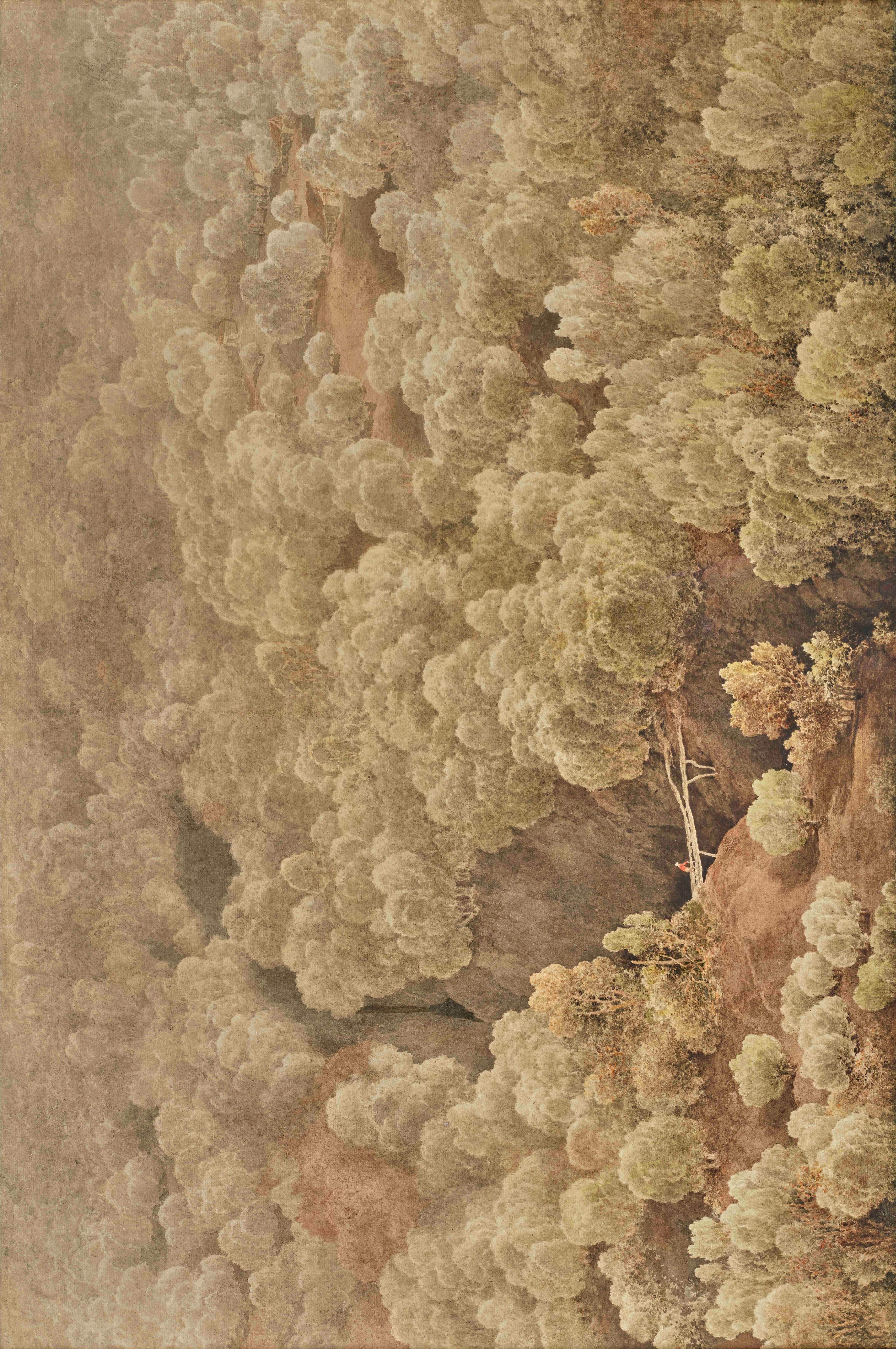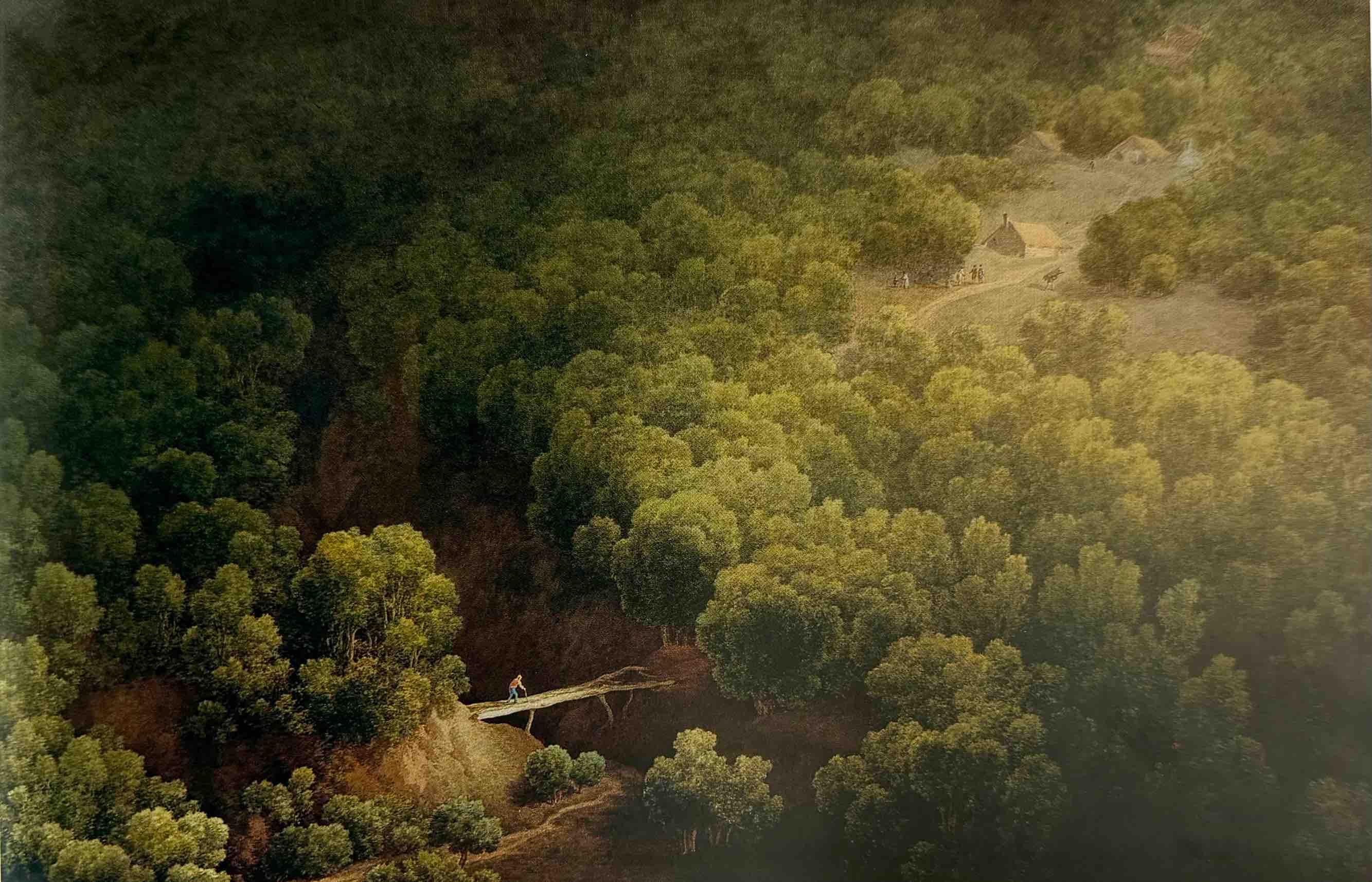 En parallèle de ses commandes gouvernementales, Bagetti poursuit une production pour les collectionneurs et le marché. Ses paysages de fiction, pittoresques et sublimes, étonnent par leur cadrage scénique, le plus souvent en surplomb, et la lumière optique et symbolique qui les éclaire. Dans notre dessin, dont on connaît une autre version à Turin appartenant à une série de près de trente paysages commandée en 1820 pour le futur roi Charles-Félix (fig.1), le regard surplombe une dense forêt, percée d’un ravin audessus duquel s’aventure, minuscule, un homme marchant avec une canne sur un tronc renversé. Il rejoint des habitations visibles dans le lointain. Le regard scientifique s’ouvre à une sensibilité rousseauiste, une célébration de la nature dans tout son mystère