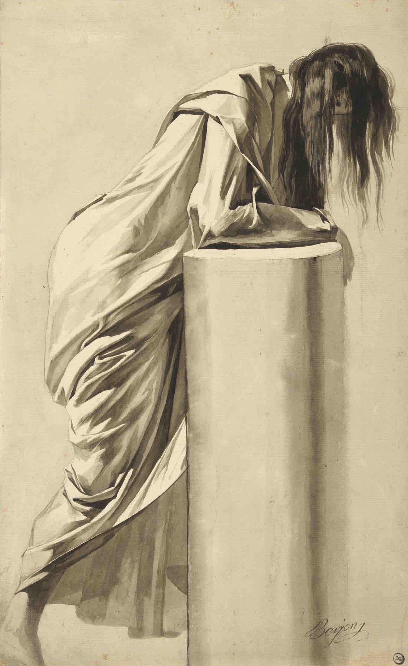 Réalisée à la plume et aux encres brune et grise, rehaussée de lavis, cette feuille témoigne de la virtuosité graphique de Berjon. Le dessin représente une figure assise, le visage dissimulé dans l’ombre de sa capuche et entièrement enveloppée d’un drapé aux plis anguleux qui évoquent les pleurants des tombeaux gothiques. Par la rigueur de la construction, la subtilité des valeurs et l’attention portée à la lumière, l’artiste dépasse le simple exercice d’atelier pour en faire une véritable étude d’atmosphère.