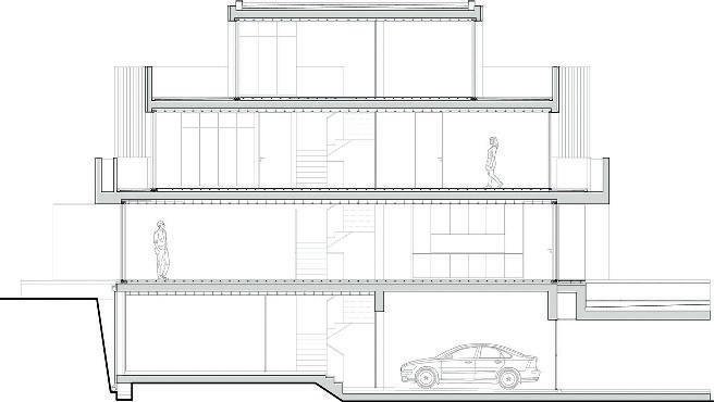Cada habitação tem a sua garagem privada. O pavimento é feito em betão polido para facilitar o trânsito dos veículos.
