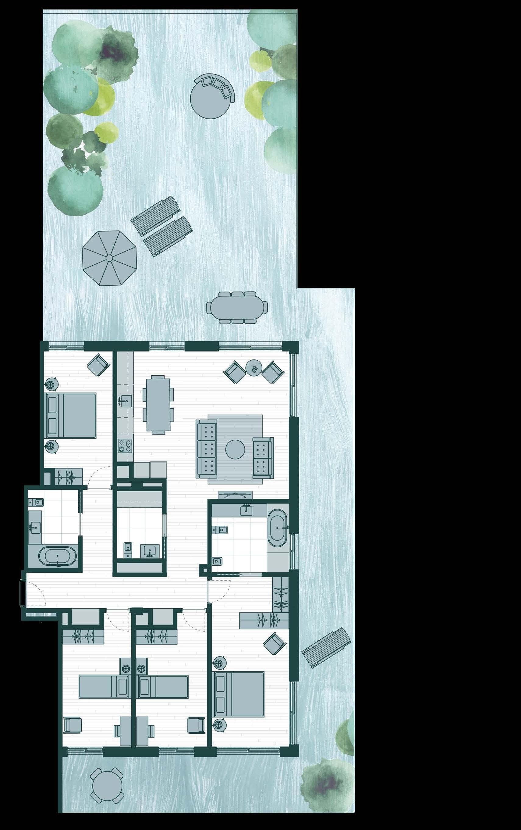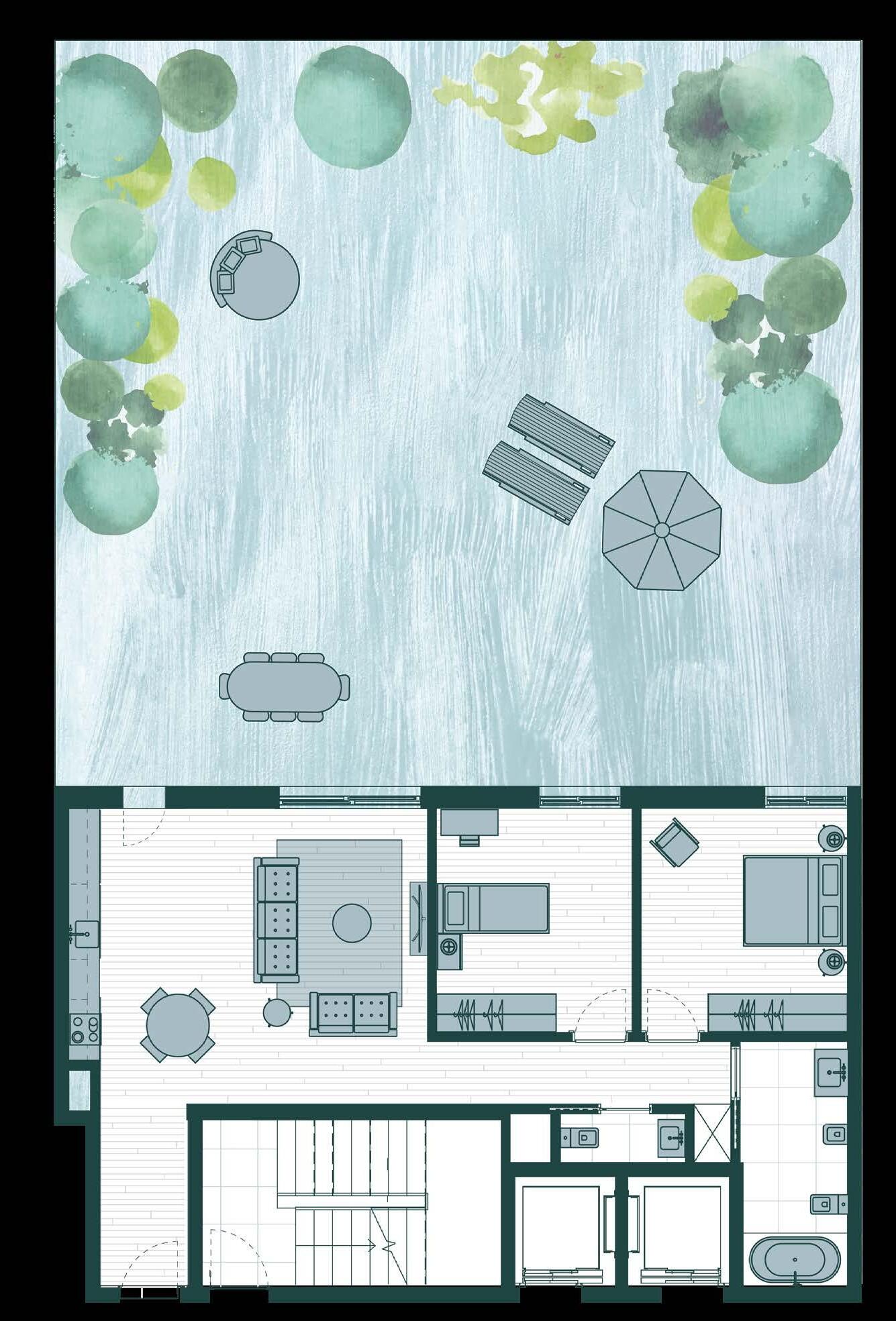 No primeiro piso, todos os apartamentos, independentemente da tipologia, abrem para um amplo terraço-jardim privado. Nos restantes pisos, mantémse a relação privilegiada com o exterior, com varandas ajardinadas, em L ou numa só linha, dando para os quartos ou zona de estar.