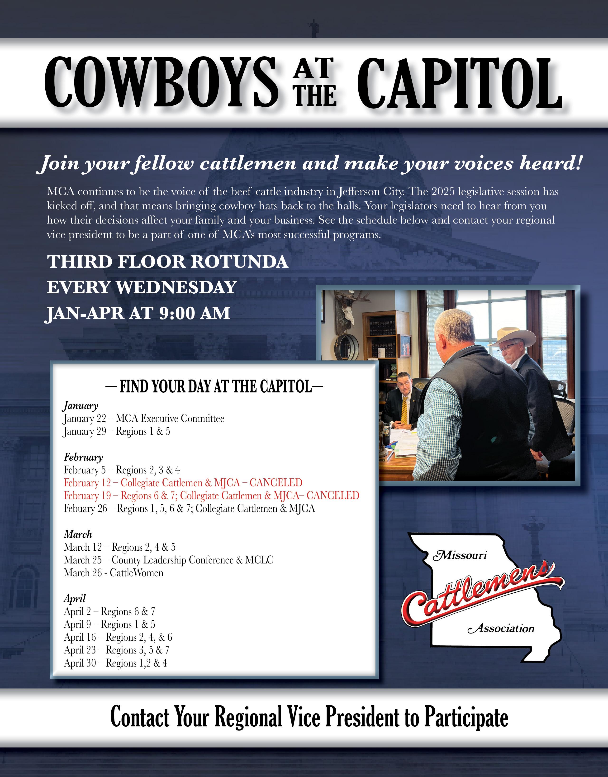 If there’s one thing we’ve learned, it’s that nothing is guaranteed in the legislative process. Even the best ideas take time, compromise, and a lot of hard work to get across the finish line. That’s why MCA’s advocacy efforts remain as strong as ever. We’re having productive discussions with lawmakers, keeping Missouri’s cattlemen at the forefront of every debate, and ensuring rural voices are heard loud and clear.
