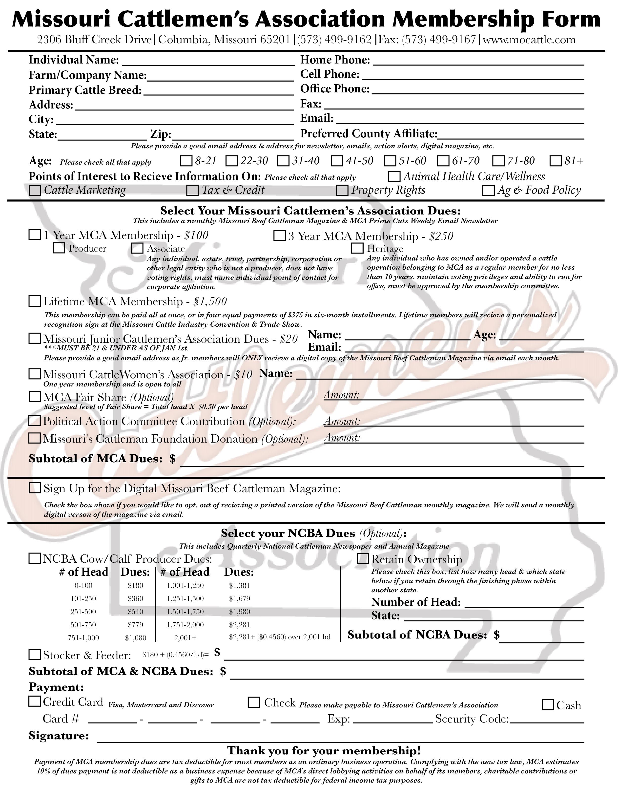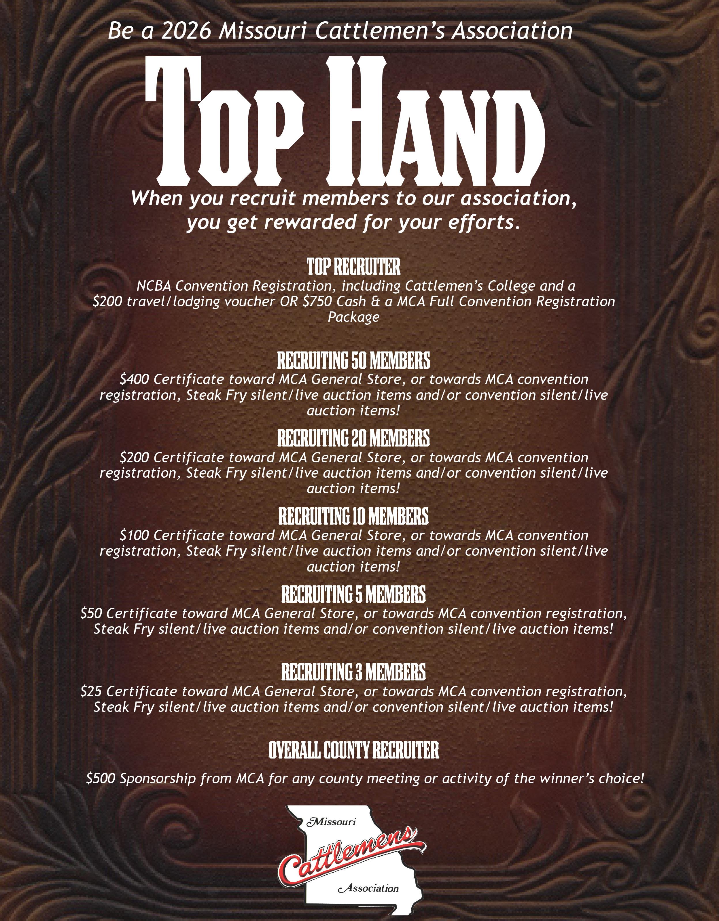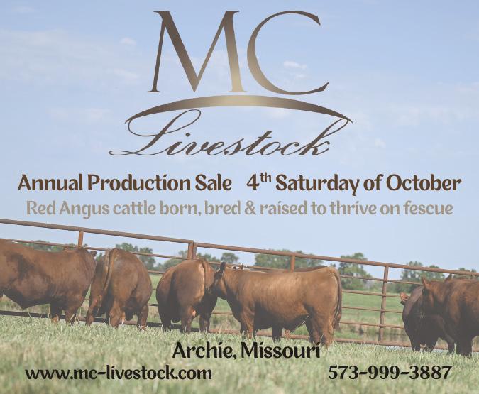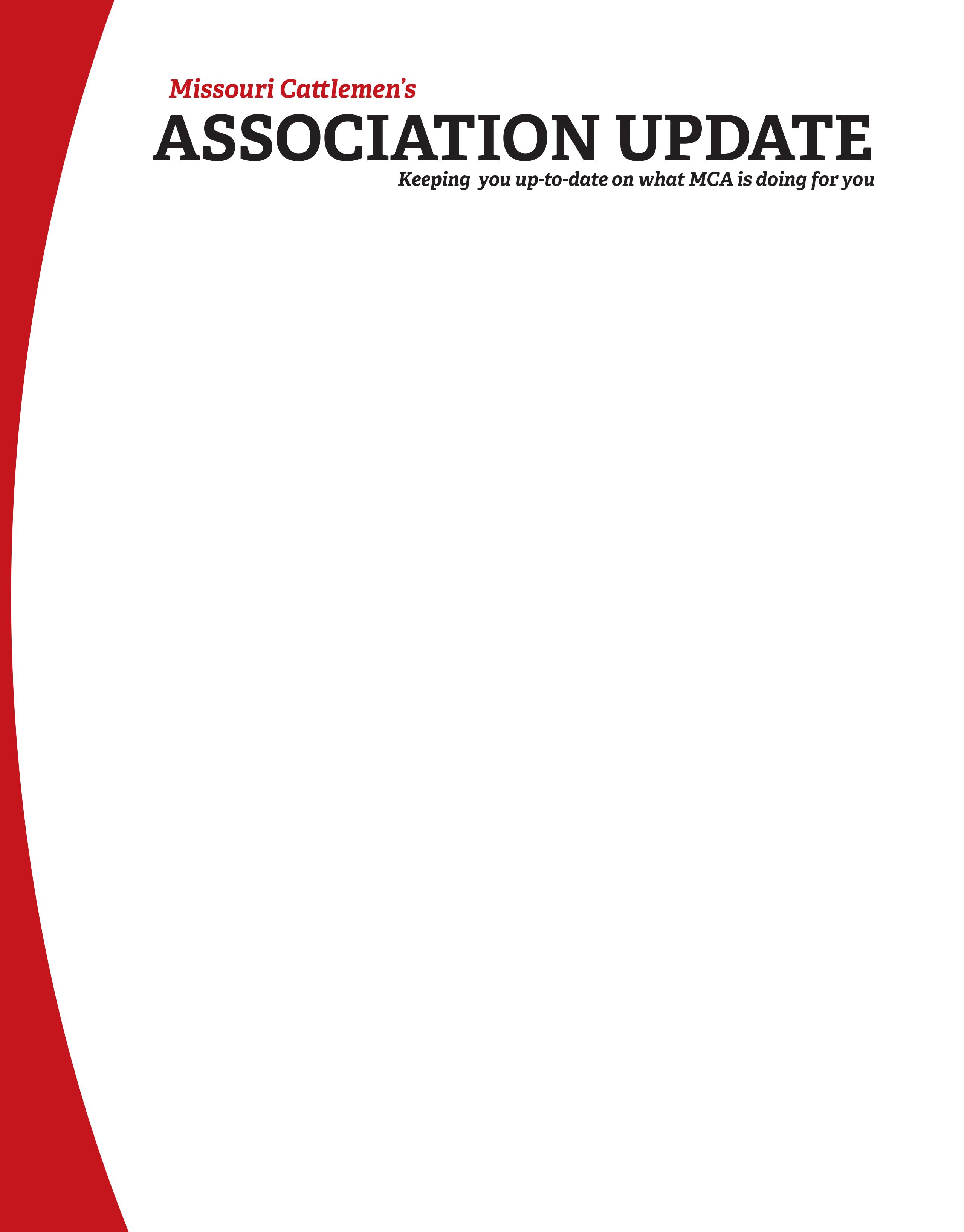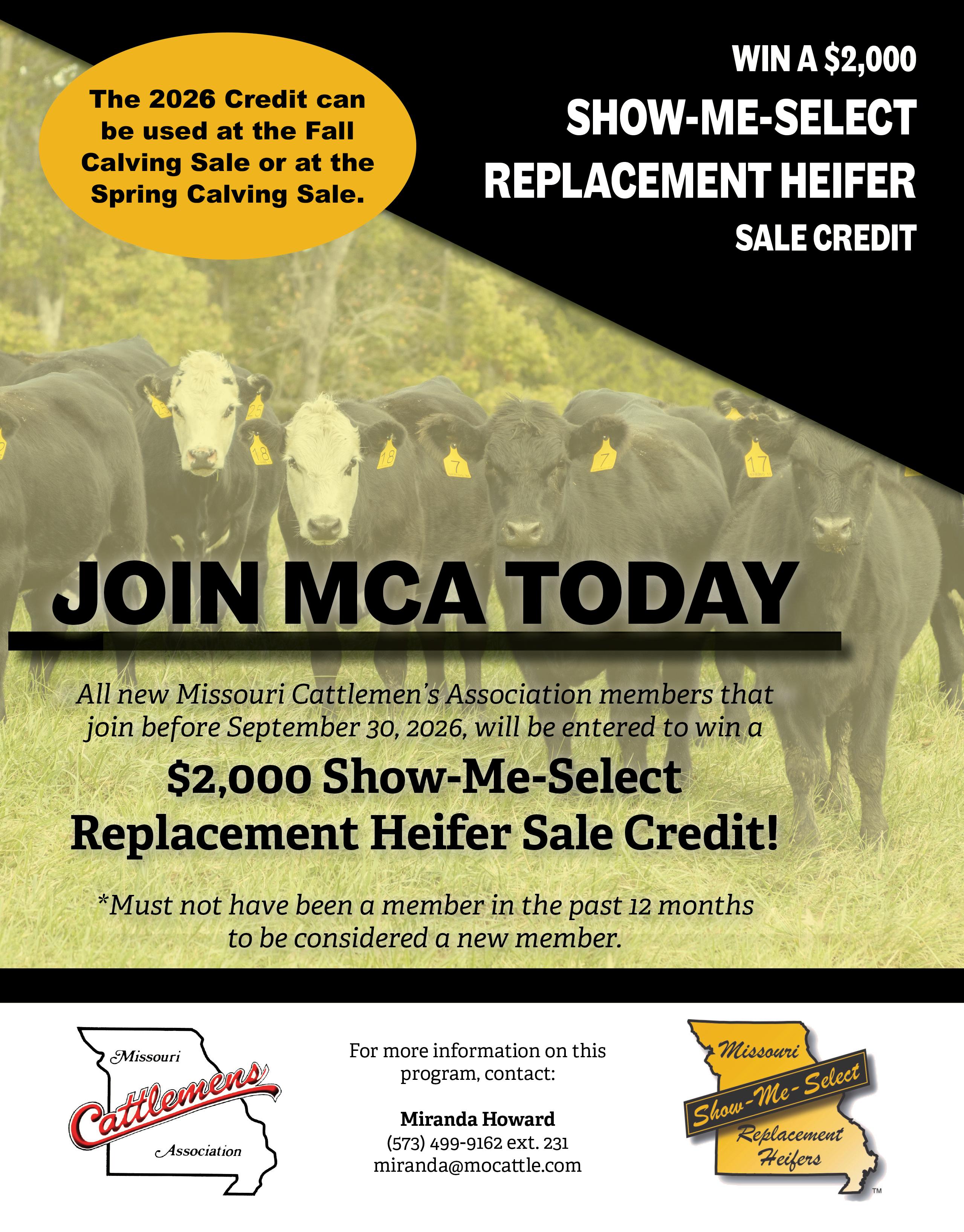 We are partnering with Show-Me-Select again this year for an exclusive new member promotion drawing. All new Missouri Cattlemen’s Association members will be entered to win a drawing for a $2,000 credit to a Show-Me-Select Replacement Heifer sale. To be considered a new member, you must not have been an MCA member within the last 12 months. Credit must be redeemed in the same calendar year at any of the spring or fall sales. Learn more on PAGE 85 .