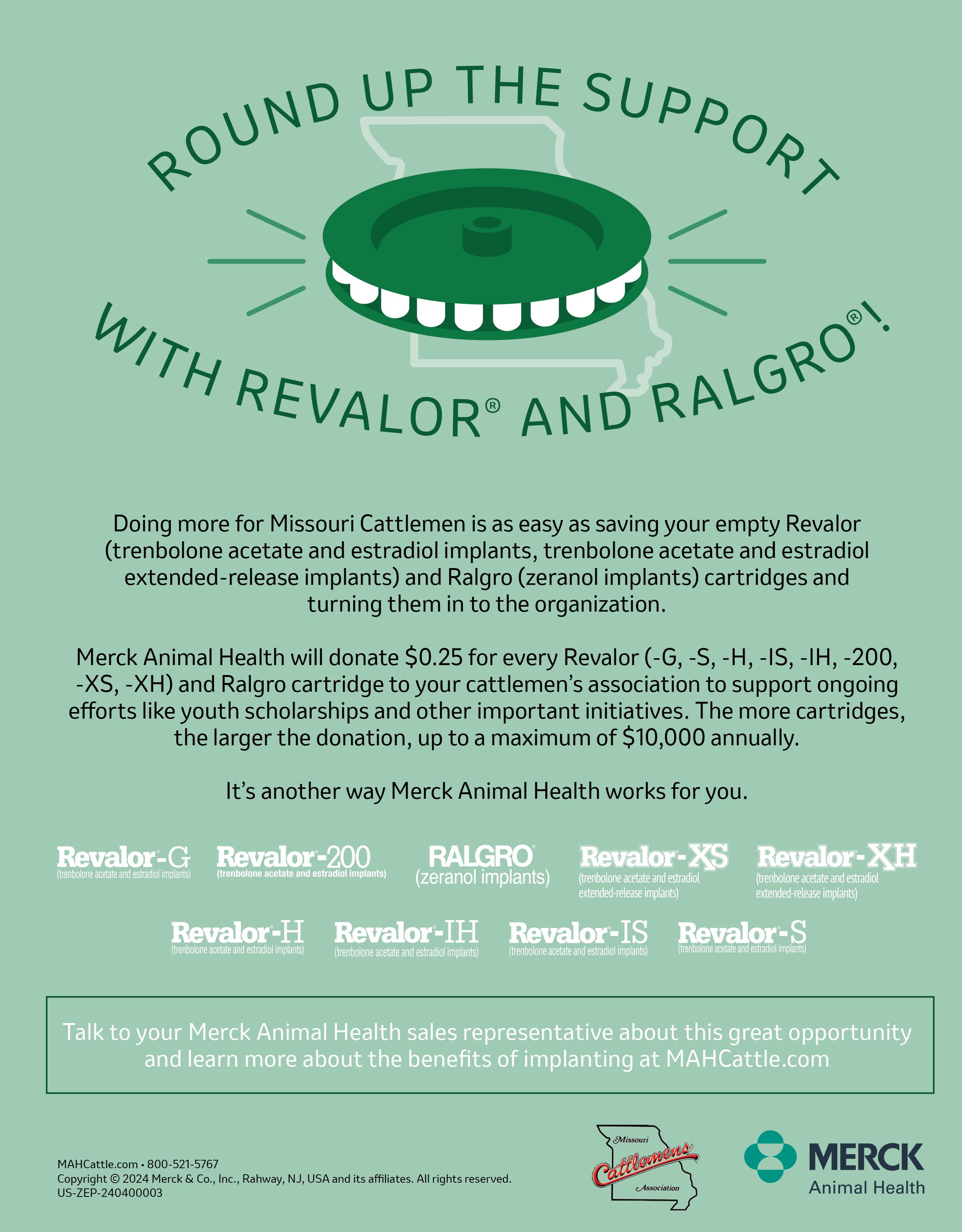 We are excited to be working with Merck Animal Health on the Cartridges for Cash program to raise funds for our association’s junior programs. We want to challenge our affiliates to a competition. The group that collects and turns in the most cartridges will win a $1,000 scholarship to award to a junior member of their choice. Each county should collect the Ralgro wheel and Revalor cartridges used by their members and bring them to either one of the Board of Director’s meeting held each quarter or to the annual convention in January. We will keep a tally of the cartridges collected from each county throughout the year and the winner will be announced at the 2026 Missouri Cattle Industry Convention & Trade Show after all cartridges are counted. To learn more about the Cartridges for Cash program, see PAGE 65.
