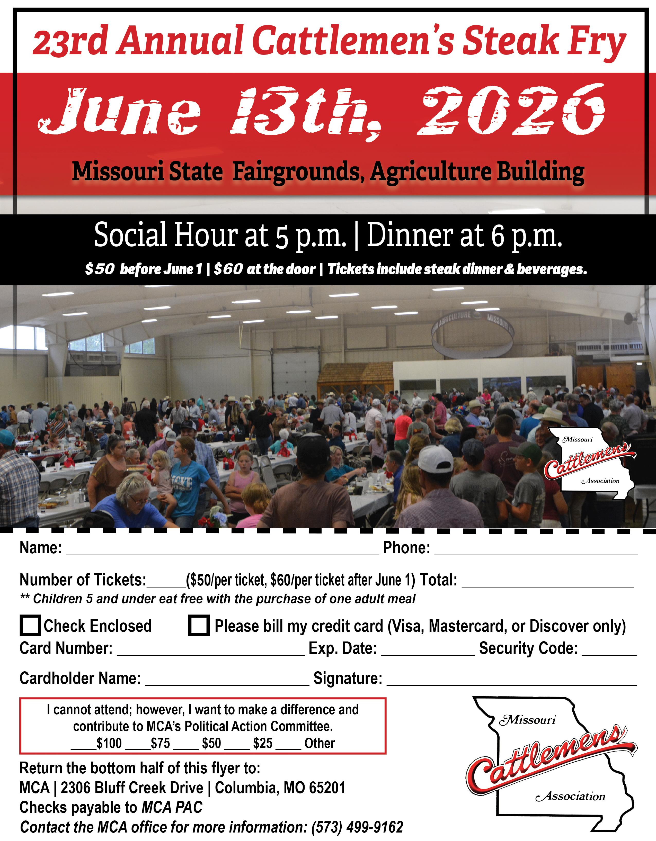 The Cattlemen’s Steak Fry will be held on Saturday, June 13th. Join us for a great steak dinner, raffles, live and silent auctions and great conversation. You’ll find the details in this month’s magazine and on our website. This event is open to the public and we welcome all people who wish to celebrate Missouri’s beef industry. Funds raised will benefit the MCA Political Action Committee to help elect leaders who understand and value agriculture to guide our state’s policy, now and in the future. For more information and registration instructions, see PAGE 36.