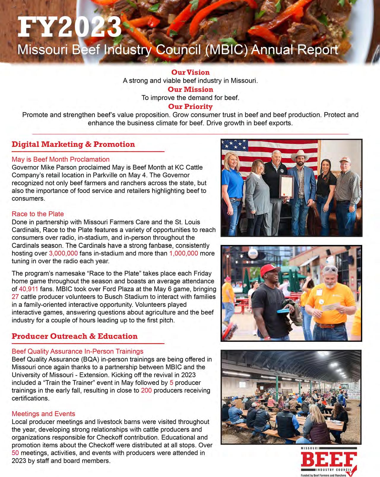 FEBRUARY 2024 5 Missouri Beef Cattleman, (USPS 890-240 • ISSN 0192-3056) is published monthly (12 times a year) and is the official publication of the Missouri Cattlemen’s Association, 2306 Bluff Creek Drive, #100, Columbia, Missouri, 65201. PERIODICALS postage paid at Columbia, Missouri and additional mailing offices. Subscription price is included as a part of the minimum membership dues of $70.00 per year in Missouri Cattlemen’s Association. Postmaster: Send address changes to: Missouri Beef Cattleman, P.O. Box 480977, Kansas City, Missouri 64148 New MCA Members MCA Convention Highlights Gelbvieh Highlight Obituaries Extension News MBIC and Mo Beef Kids News USMEF Update 7 21-34 42 64-70 74 82 84