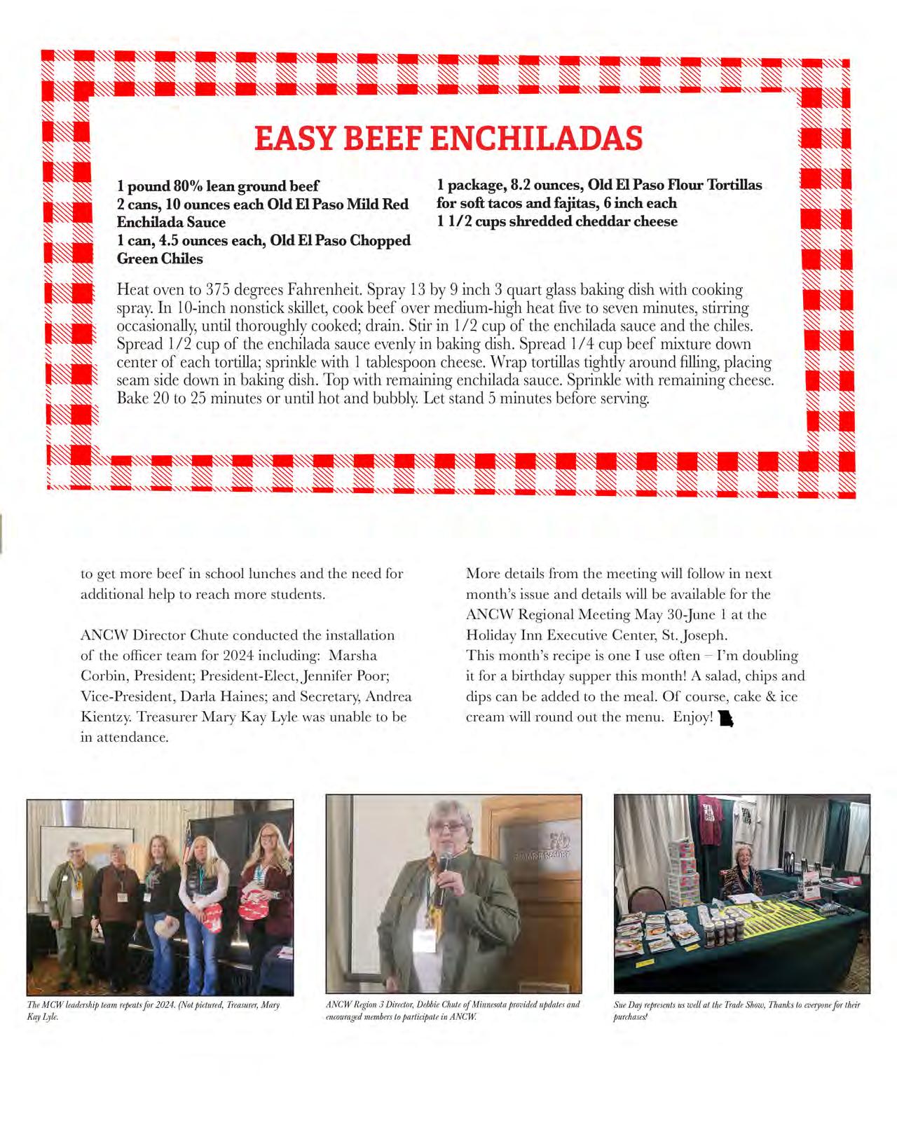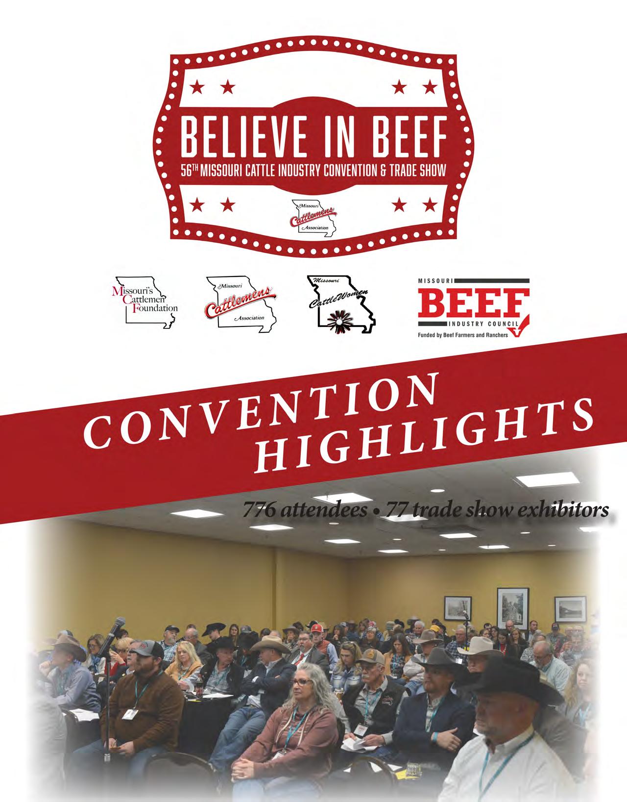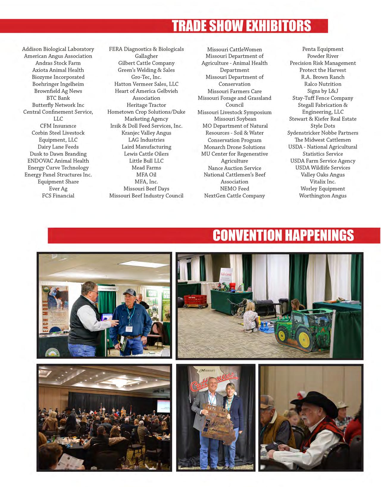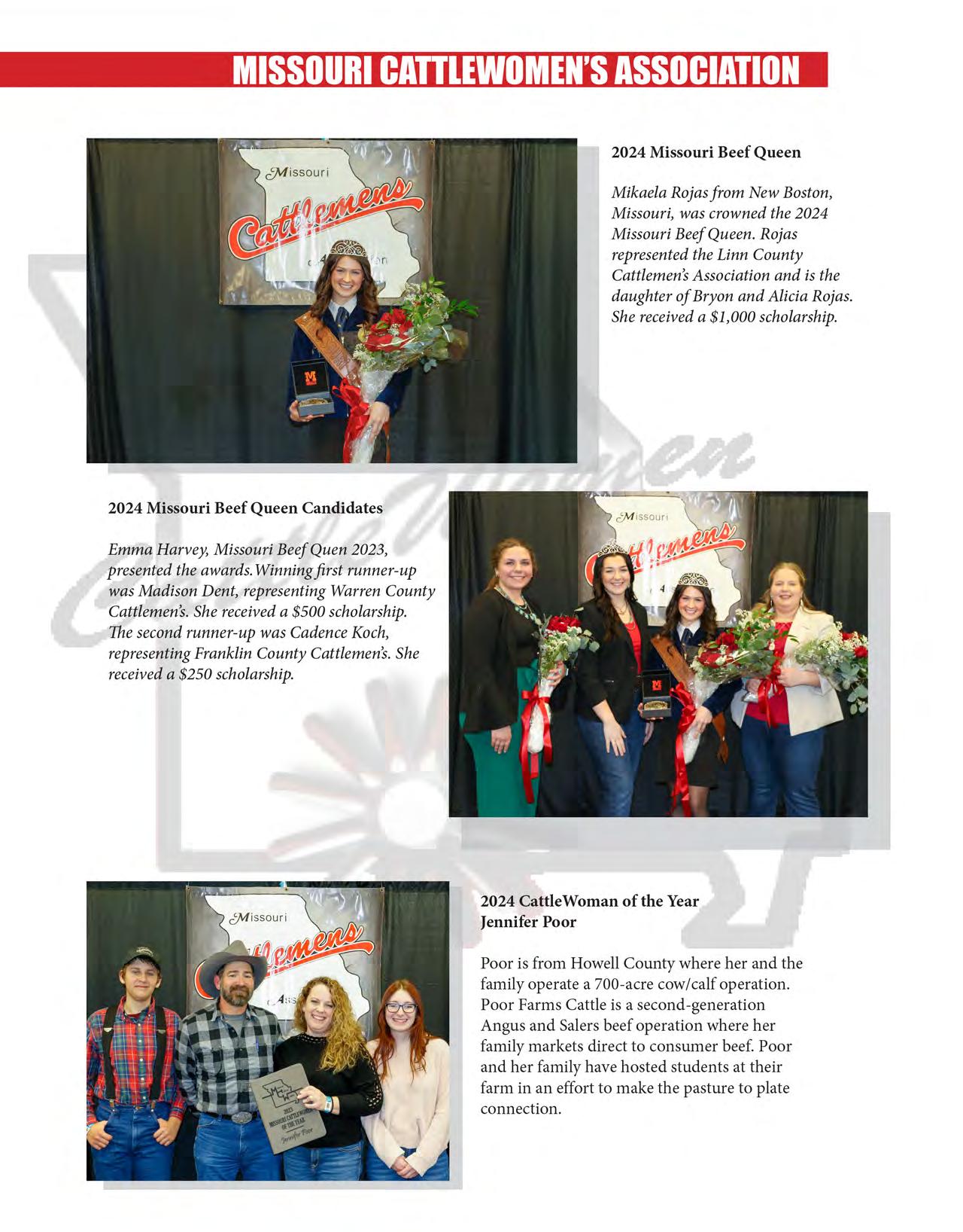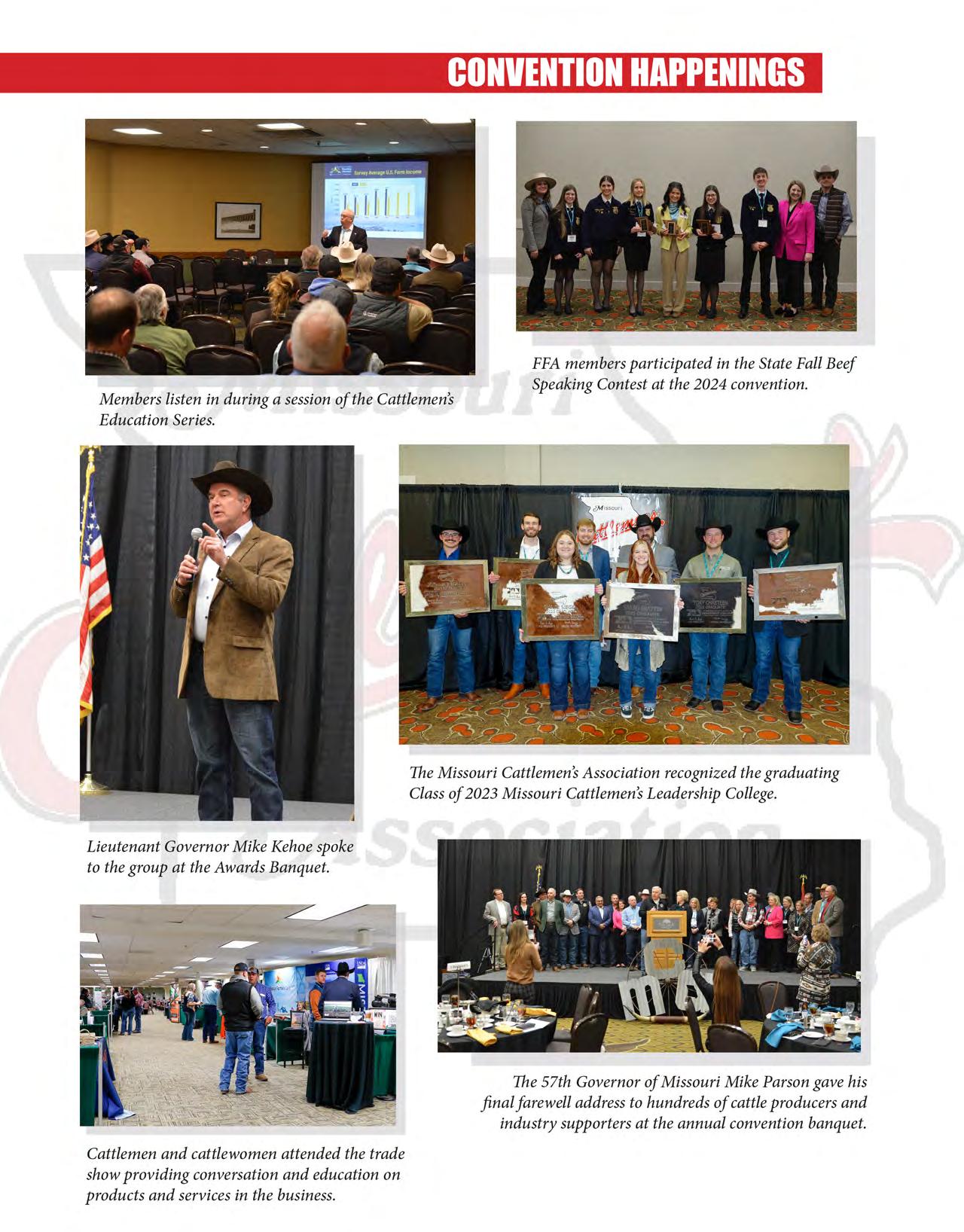 CONTENTS Missouri Cattle Industry Convention & Trade Show Highlights Over 700 People in Attendance at 2024 Convention Dedicated to Serve One Cattleman’s Passion for the Beef Industry Leads Him to Presidency 21 36 FEATURES MCA President’s Perspective Don’t Sell Your Saddle CattleWomen’s Corner And We’re Off! Straight Talk: Mike Deering The Gathering Regional Range Report Membership Matters What’s Cooking at the Beef House We Have a Winner! Capitol Update It’s Go Time 8 10 12 14 18 86 Association Update Beef Checkoff News County News 6 16 56 The Missouri Beef Cattleman is an official publication of the Missouri Cattlemen’s Association. February 2024 MEMBER NEWS COLUMNS 36 Dedicated to Serve 21 MCA Convention Highlights