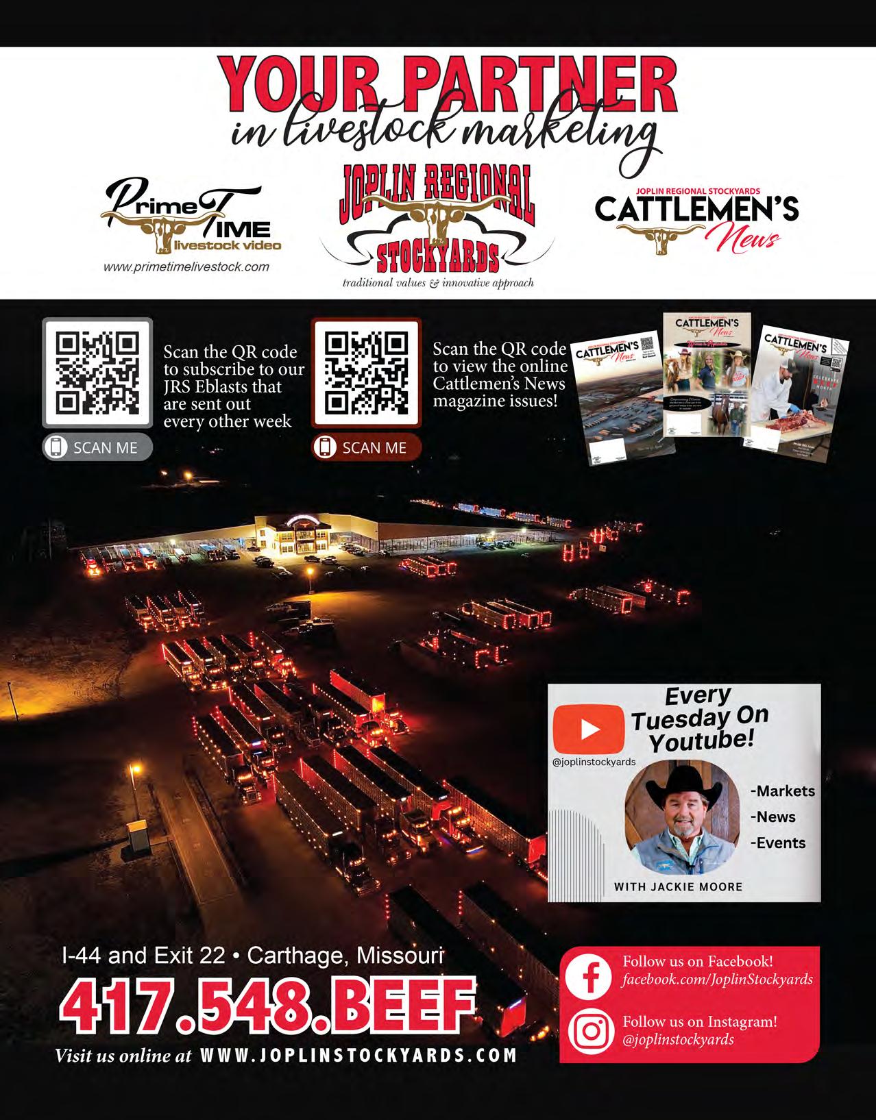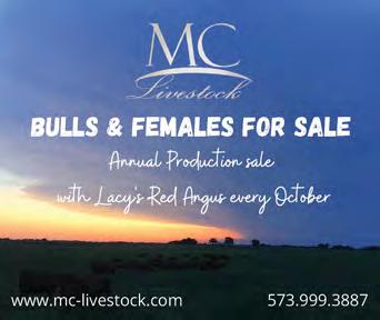 FEBRUARY 2024 98 Advertiser Index AICA ............................................................................ 85 American Angus Association ....................................... 65 American Food Group ................................................. 79 American Gelbvieh Association 43 Aspen 59 Barrett & Mill Brae Sale 33 Boa Safra 25 Bradley Cattle ..............................................................61 Bredemeier Angus Sale ................................................ 73 Brickhouse Farms Red Angus.......................................61 Buffalo Livestock Market 76 Busch Cattle Co. 57 Callaway Livestock Center Inc. 82 Champion Feeders 83 Classified ...................................................................... 97 Clearwater Farm ...........................................................57 Coon Angus Ranch ......................................................57 Double A Land & Cattle ...............................................61 Ellis Cattle Company Red Angus 61 Ertel Gelbvieh 52 Express Ranch Sale 99 F&T Livestock Market ................................................. 56 FCS of Missouri ......................................................... 100 Feed Train .................................................................... 62 Frank and Hazelrigg Angus .........................................57 Friday - Cartoon 96 Galaxy Beef LLC 57 Galaxy Beef LLC Sale 35 Gerloff Farms ................................................................57 Gibbs Farms Sale ......................................................... 69 Green’s Welding & Sales ................................................ 7 Heart of America Gelbvieh Association ...................... 53 Hilltop Gelbvieh Sale 45 Hinkle’s Prime Cut Angus 57 Hinkle’s Prime Cut Angus Sale 63 HydraBed ..................................................................... 58 Jim’s Motors ................................................................. 76 Joplin Regional Stockyards............................................ 3 Kingsville Livestock Auction ....................................... 50 KK Farms Red Angus 61 Kranjec Valley Angus Farma 57 Lacy’s Red Angus 61 Maple Oaks Red Angus ................................................61 Marshall & Fenner Farms .............................................57 MC Livestock Red Angus .............................................61 MCA - County Leadership Conference ...................... 20 MCA - Cowboys at the Capitol 88 MCA - Expo Weekend 2024 90 MCA - FFA Fantasy Feedout Draft Day 54 MCA - Liability Signs .................................................. 94 MCA - Membership Form ........................................... 93 MCA - Policy Priorities ................................................ 87 MCA - Presidents Council ............................................91 MCA - Profitability Challenge .................................... 89 MCA - Top Hand 92 Mead Farms 57 Mead Farms Sale 19 Merck Animal Health 29 Meyer Mfg.................................................................... 77 MFA .............................................................................71 Missouri Angus Association..........................................57 Missouri Angus Breeders 57 Missouri Beef Industry Council 17 Missouri Department of Agriculture 15 Missouri Red Angus Association 61 Missouri Red Angus Breeders ......................................61 Moriando & MM Farms Sale ...................................... 67 Northeast Arkansas Angus Assn Spring Sale .............. 75 Ory’s 07 Red Angus .................................................... 62 Performance Tested Bull Sales 55 Post Rock Cattle Co. Sale 51 Rogers Cattle Co. and Lile Farms Red Angus 61 S&N Partners ............................................................... 44 Salt Fork Equipment - NDE ........................................ 52 Sampson Cattle Co. ......................................................57 Sampson Cattle Co. Sale ..............................................81 Seedstock Plus Sales 49 Sellers Feedlot 72 Shoal Creek Land & Cattle Red Angus 61 Show-Me-Select Sale Credit Program ........................ 78 Slayton Farms ...............................................................61 Soapweed Gelbvieh ...................................................... 50 South Central Regional Stockyards ............................ 58 Specialty Risk 84 Superior Steel Sales 72 Sycamore Creek 82 Sydenstricker Genetics ..................................................57 T Bar S Cattle Co. ........................................................61 T Bar S Sale ..................................................................47 Touchstone Energy/AMEC ......................................... 23 Valley Oaks Angus 57 Valley Oaks Angus Sale 13 Vitalix 9 Weiker Angus Ranch ....................................................57 Wheeler Auctions & Real Estate .................................. 84 Wheeler Livestock Market ........................................... 95 Mike Williams ............................................................. 84 Windrush Farm Red Angus 61 Wright Charolais Sale 39 Y-Tex 2 Zeitlow - Ritchie Waterers ........................................... 64