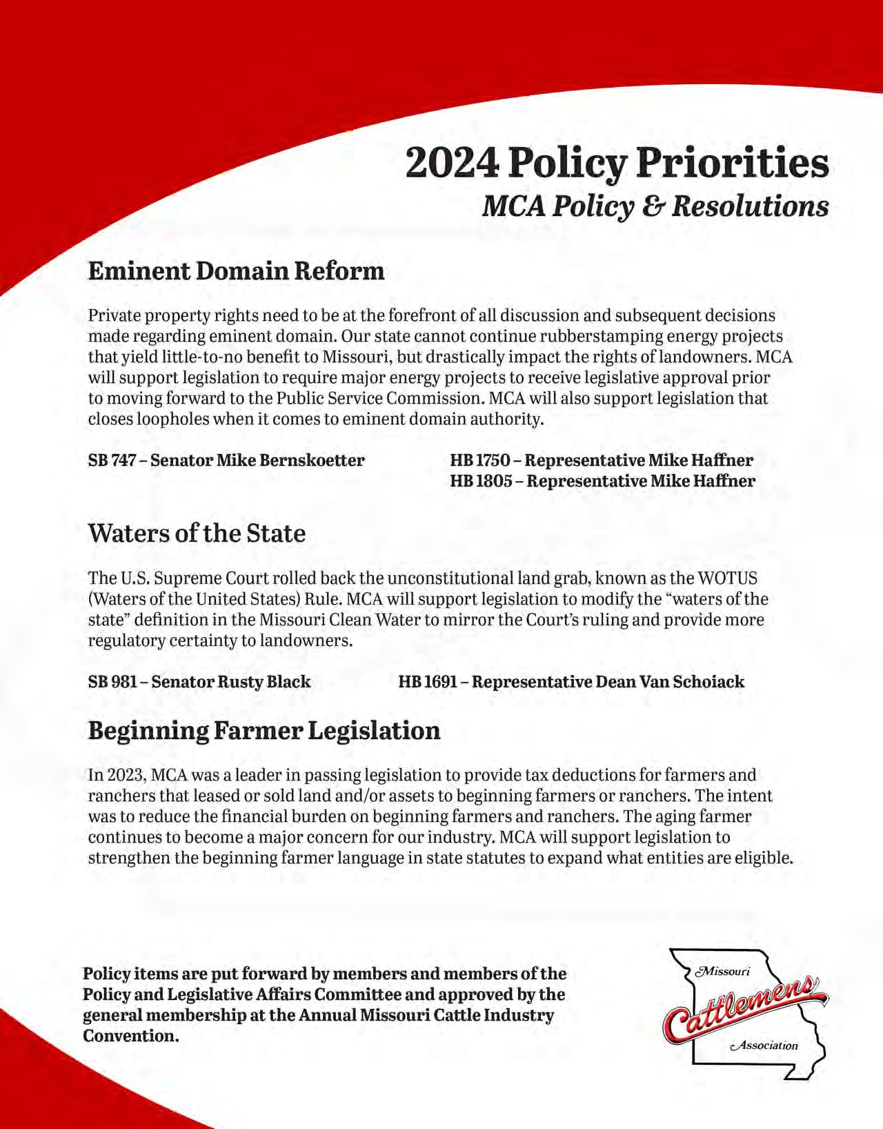 Missouri Cattlemen’s Leadership College participants and affiliate leadership will gather in Columbia for the 2024 County Leadership Conference. Attendees will dive deeper into the relationship the association has with its affiliates, undergo media training, and learn how to efficiently run a meeting. The second day of the conference is spent in Jefferson City where attendees will have the opportunity to visit with legislators about MCA policy priorities. This year’s event will be held March 5-7. See the registration form on PAGE 20.