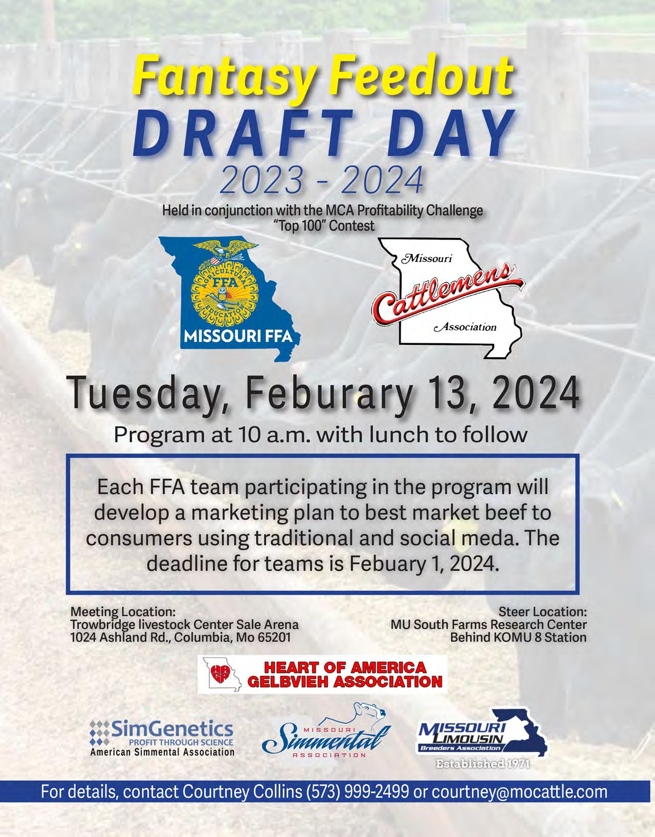 FFA Fantasy Feedout Draft Day will occur on Tuesday, February 13, 2024, with the program beginning at 10 a.m. and lunch to follow. The program will take place at Trowbridge Livestock Center Sale Arena in Columbia, Mo. If you or your chapter would like to participate in the 2023-2024 FFA Fantasy Feedout, please visit mocattle.com for more info or see PAGE 54.