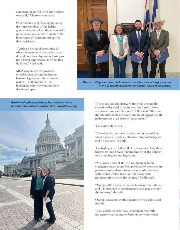 CONTENTS MCLC Takes Washington D.C. Twenty-Four Missouri Cattle Producers Visit the Nation’s Capitol to Address Industry Issues Seeking Sludge Solutions Producers Explore Opportunities and Drawbacks of Wastewater and Food Processing Residuals 22 54 FEATURES MCA President’s Perspective A Lot of Activity CattleWomen’s Corner CattleWomen at Work Straight Talk: Mike Deering Needle in a Haystack Regional Range Report What Makes an Impact What’s Cooking at the Beef House Volunteer Tips Capitol Update Session is Complete 8 10 12 14 16 64 Association Update Beef Checkoff News County News 6 18 34 The Missouri Beef Cattleman is an official publication of the Missouri Cattlemen’s Association. June 2023 MEMBER NEWS COLUMNS 54 Seeking Sludge Solutions MCLC Takes Washington D.C. 22 Cover Photo by Carla Leland for the RAAA