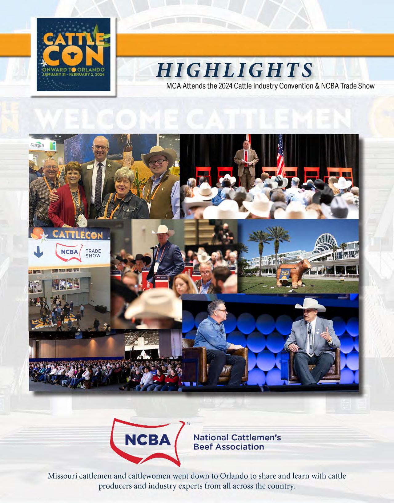 CONTENTS 2023 Cattleman of the Year MCA Past President’s Journey to Earning Prestigous Award NCBA CattleCon Highlights MCA Attends the 2024 Cattle Industry Convention & NCBA Trade Show 20 26 FEATURES MCA President’s Perspective We Are Here to Work for You CattleWomen’s Corner LEADERSHIP - Everyday! Straight Talk: Mike Deering Doing Nothing Solves Nothing Regional Range Report Governance Task Force What’s Cooking at the Beef House Beef House Committee Capitol Update Thank You! 8 10 12 14 18 86 Association Update Beef Checkoff News County News 6 16 34 The Missouri Beef Cattleman is an official publication of the Missouri Cattlemen’s Association. March 2024 MEMBER NEWS COLUMNS 26 CattleCon Highlights 20 Cattleman of the Year