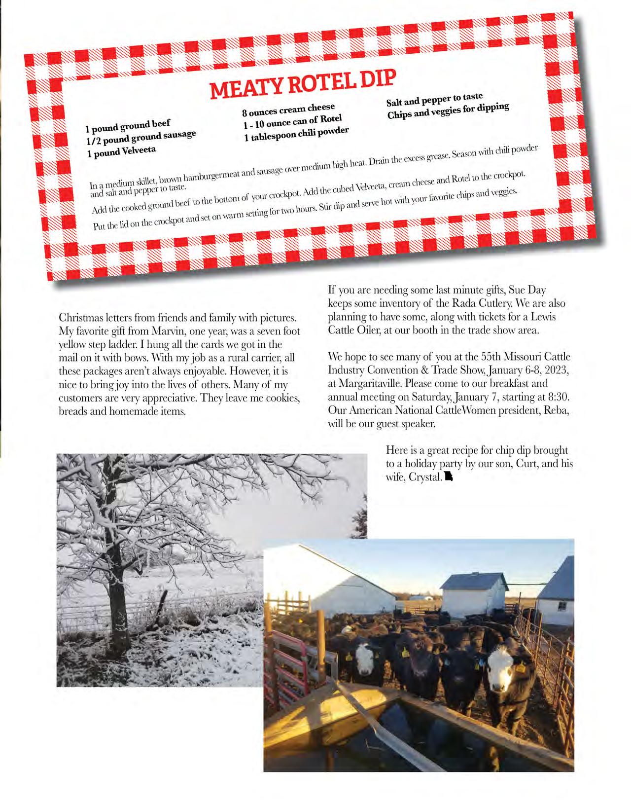 Missouri Beef Cattleman, (USPS 890-240 • ISSN 0192-3056) is published monthly (12 times a year) and is the official publication of the Missouri Cattlemen’s Association, 2306 Bluff Creek Drive, #100, Columbia, Missouri, 65201. PERIODICALS postage paid at Columbia, Missouri and additional mailing offices. Subscription price is included as a part of the minimum membership dues of $70.00 per year in Missouri Cattlemen’s Association. Postmaster: Send address changes to: Missouri Beef Cattleman, P.O. Box 480977, Kansas City, Missouri 64148