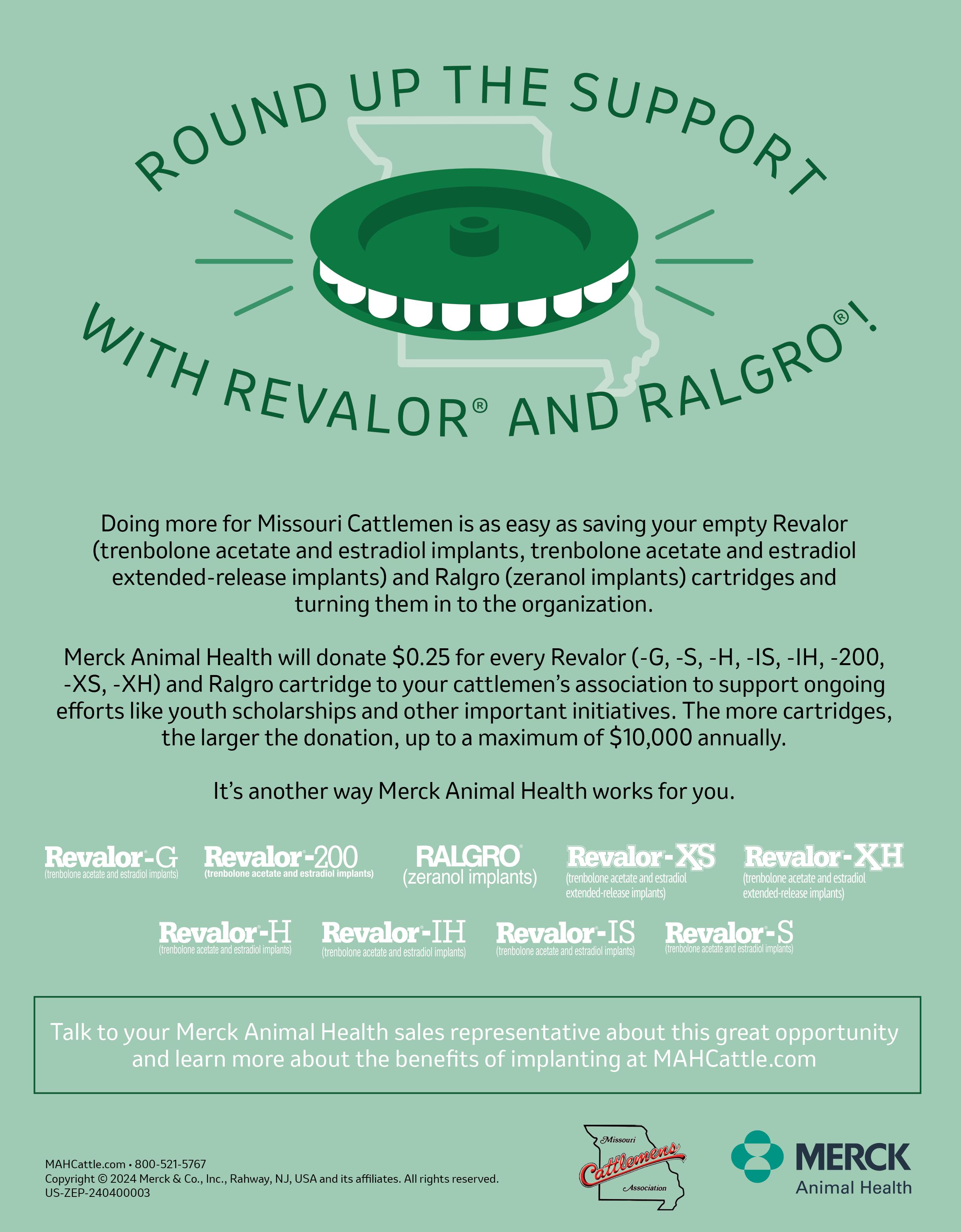 We are excited to continue our partnership with Merck Animal Health on the Cartridges for Cash program to raise funds for our association’s junior programs. We want to challenge our affiliates to a competition. The group that collects and turns in the most cartridges will win a $1,000 scholarship to award to the junior member of their choice. Each county should collect the Ralgro wheel and Revalor cartridges used by their members and bring them to either a Board of Director’s meeting each quarter or to the annual convention in January. We will keep a tally of the cartridges collected from each county throughout the year and the winner will be announced at the 2026 Missouri Cattle Industry Convention & Trade Show after all cartridges are counted. To learn more about the Cartridges for Cash program, see PAGE 72.