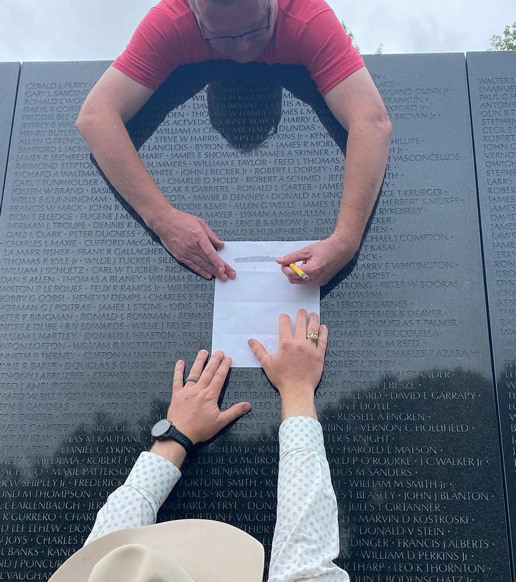 We were able to explore some history just before our long-delayed flight home and pictured below is Mike Deering helping me shade in some immediate family from the Vietnam Wall Memorial.