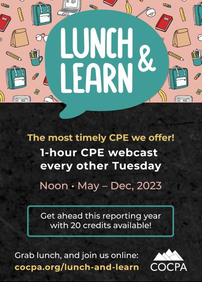 → Watch COCPA’s NewsQuick electronic newsletter or the Recent Advocacy News and Updates on the Advocacy page of cocpa.org for calls to action in reviewing and providing feedback on important tax legislation and CDOR rulemaking.