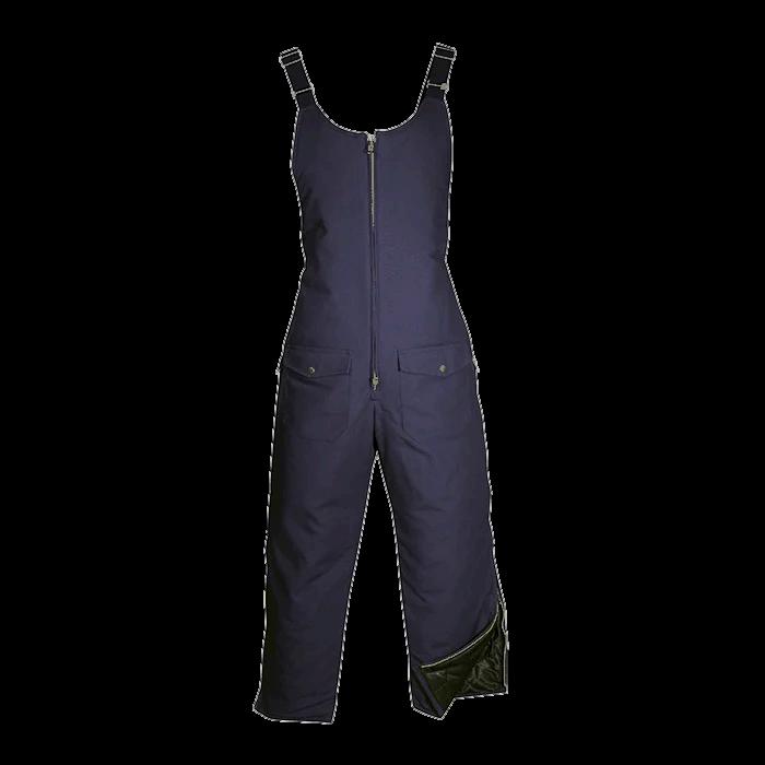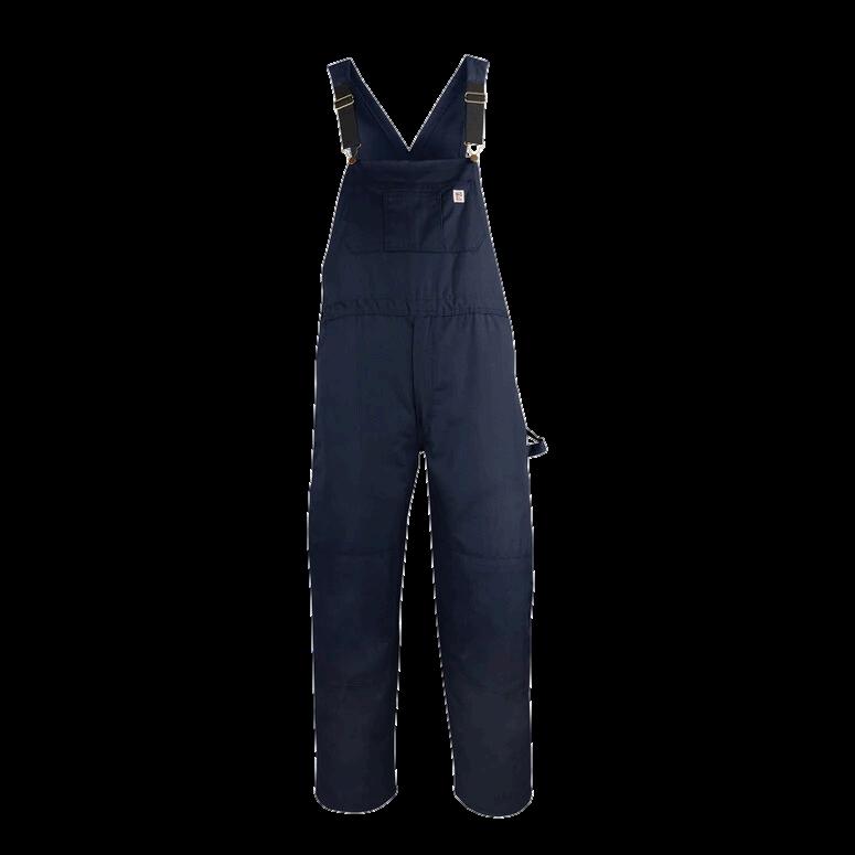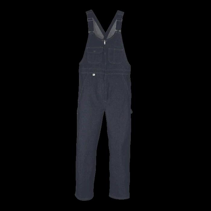 Elastic suspenders with adjustable buckle | Two-way brass zipper front closure | 2 front chest pockets with flap and snap closure | 2 slash pockets at waist with side openings | 2 large double stitched back pockets | Hammer loop