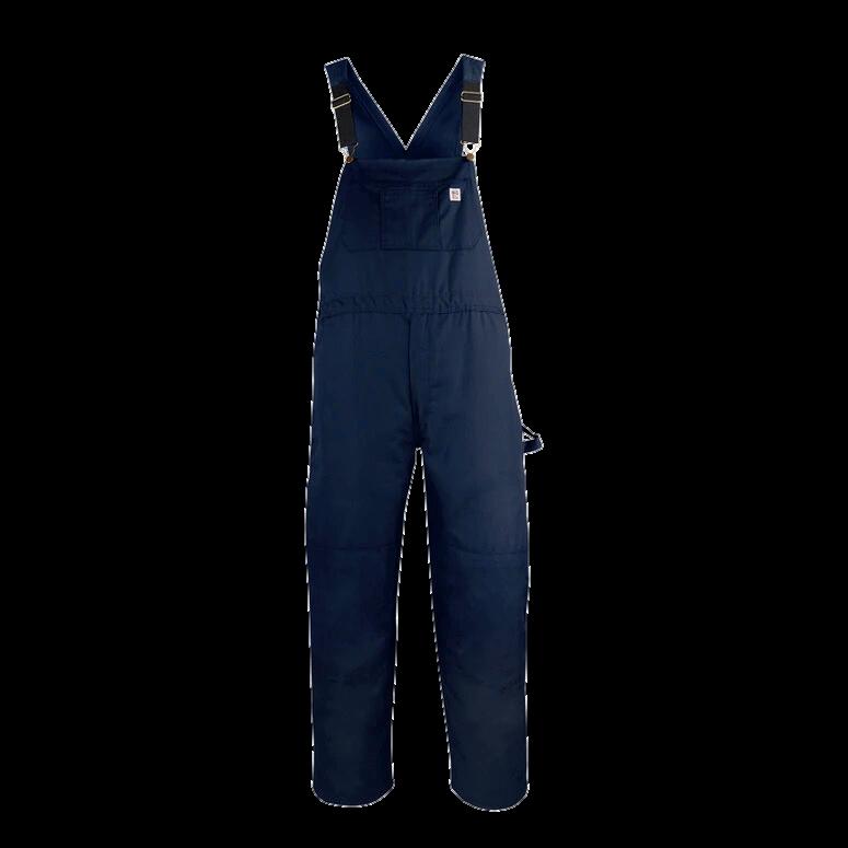 Bretelles élastiques avec boucles ajustables | Fermeture avant à glissière en laiton à double sens | 2 poches poitrine avec rabat et boutons-pression | 2 poches en biais à la taille avec ouvertures latérales | 2 grandes poches arrière à double piqûre |