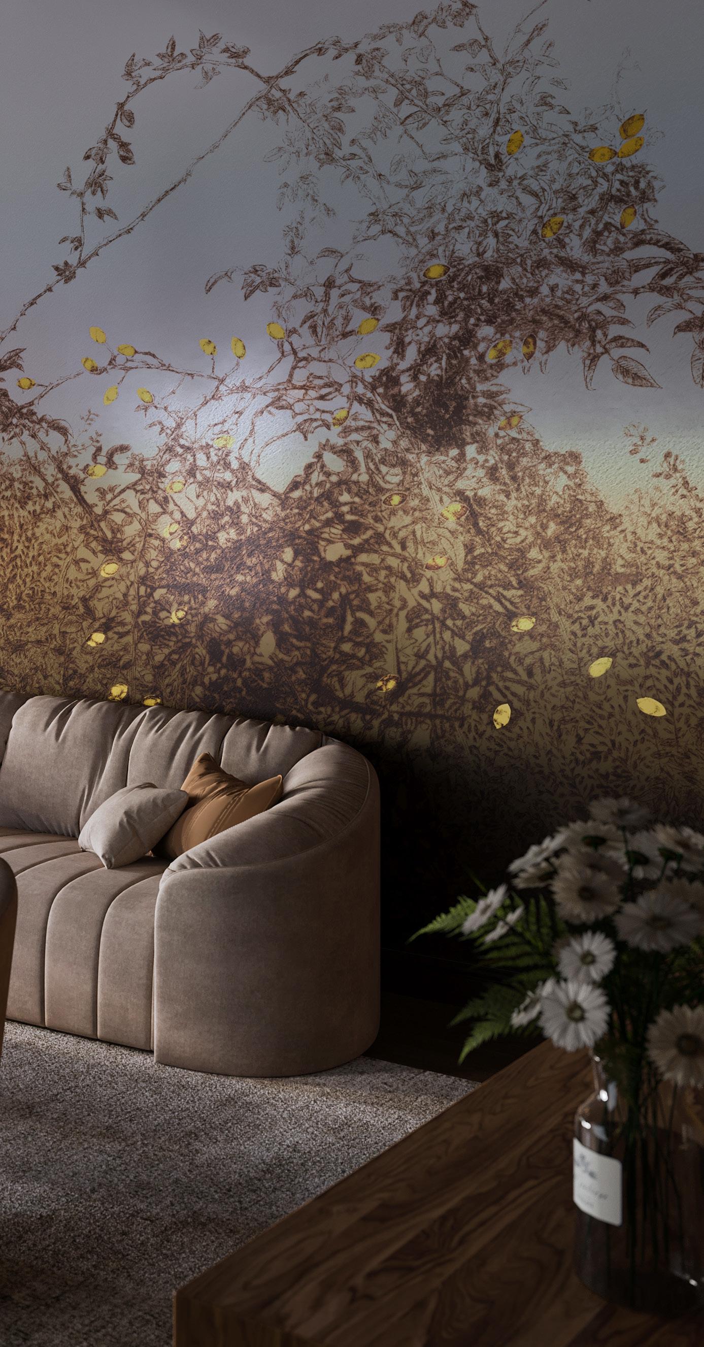 Introducing Trellis, new from the Oasis collection. The large-scale four-panel mural of Trellis features vines of foliage and vibrantly colored leaves that seemingly climb up the wall, adding a romantic, enchanting ambiance to any room or setting. The subtle ombré background is printed over an Innovations classic metallic fabric faced vinyl, enhancing the botanical motif with a warm glow reminiscent of golden hour.