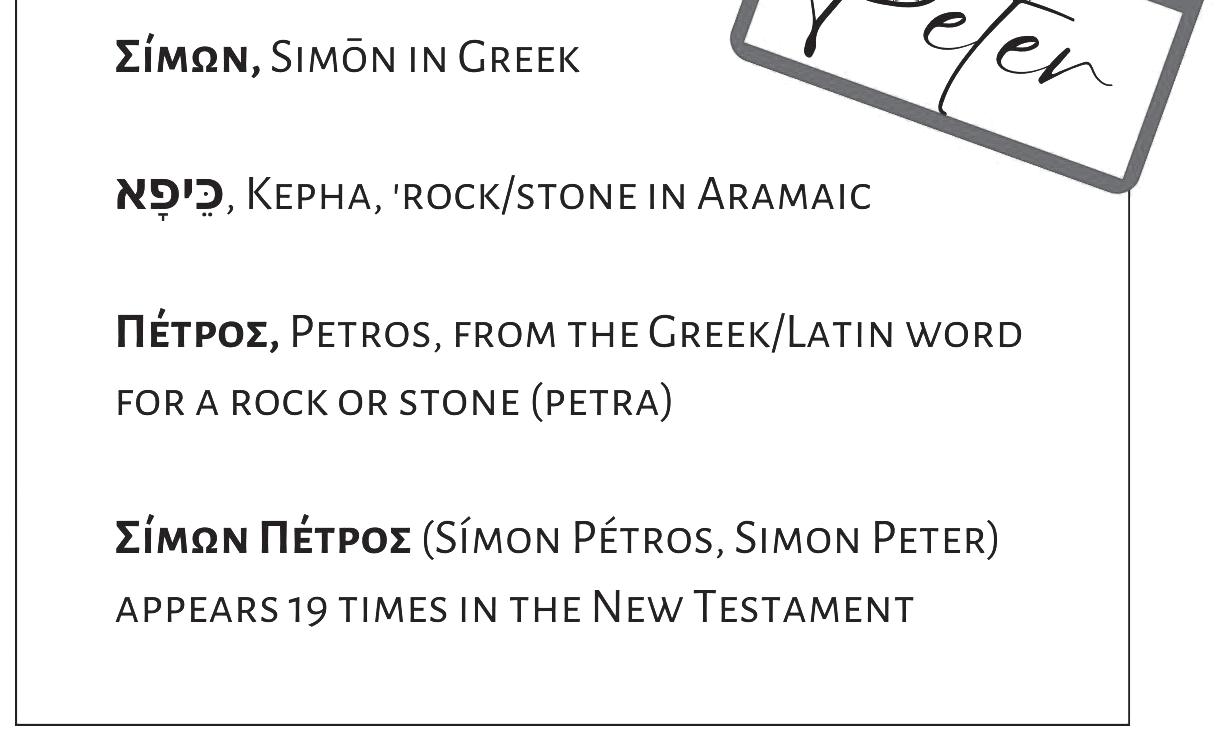 My given name was Simon, from the Hebrew word ןוֹעְמׂשׁ (Šim‘ôn), meaning “to listen” or “to hear.” It was a pretty common name around here. Nothing special, really. It was meant to remind me to take in any knowledge I was given along life’s journey. I didn’t always do that. I did try, but I confess I was not much known for my patience. I made quick decisions about some things . . . okay, maybe most things. I met Jesus, and He changed my life. Despite all my mistakes and failures, Jesus wanted me with Him. He still chose me and allowed me the honor of serving alongside Him. I’m still in awe of that. I never thought this fisherman would leave his boat to follow a man like Jesus. He made me bold in ways I never expected.