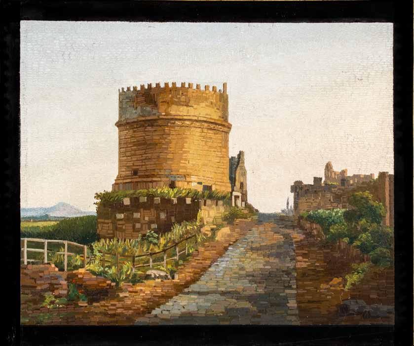 Roma, prima metà XIX Sec. di forma ottagonale con placca ovale in micromosaico raffigurante “Il Foro Romano”, orafo Luigi Mascelli, battuta in argento, restauri 2,2x6,5x4 cm.