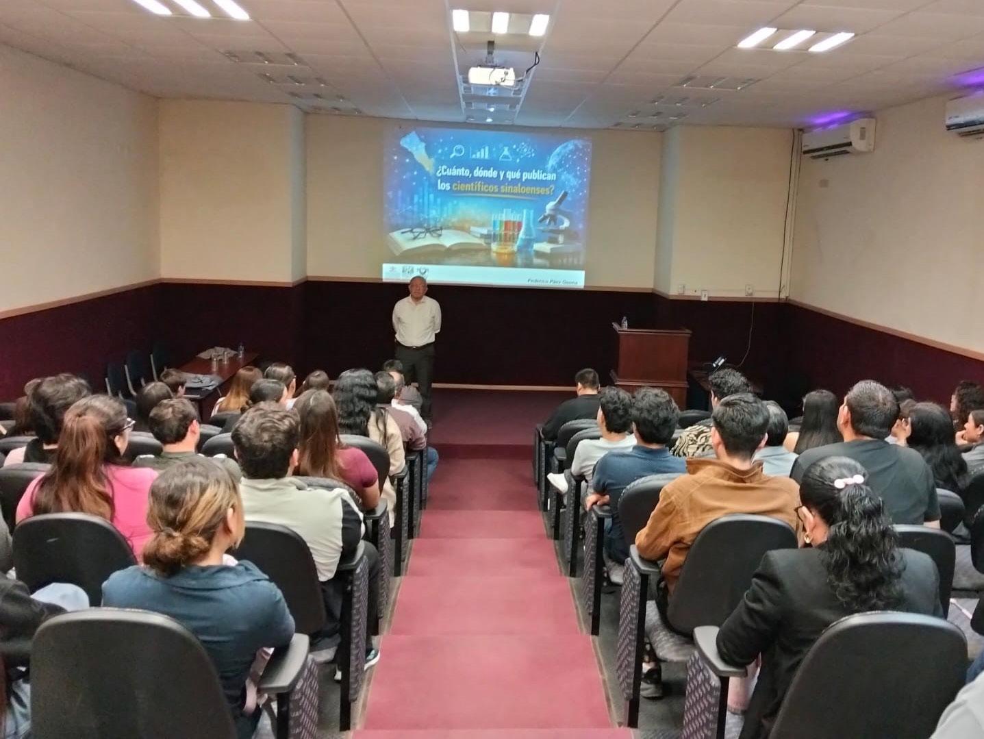 Al reconocer que los científicos e investigadores requieren fortalecer la divulgación de sus trabajos, el Dr. Federico Páez Osuna presentó la conferencia: ¿Cuánto, dónde y qué publican los científicos sinaloenses?, a los estudiantes de la Facultad de Ciencias Químico-Biológicas de la Universidad Autónoma de Sinaloa, el viernes 20 de febrero, como parte de su agenda académica como miembro de El Colegio de Sinaloa para el primer semestre de 2026.