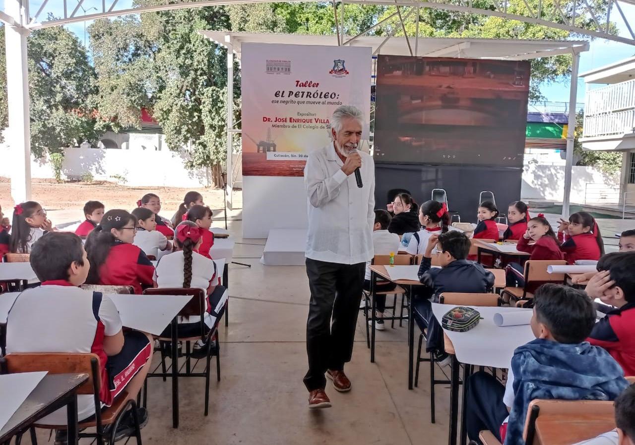 Para incentivar la curiosidad por temas relativos a la presencia de la ciencia y la tecnología en la vida cotidiana, el Dr. José Enrique Villa Rivera ha impartido el taller: El petróleo, ese negrito que mueve al mundo, a niñas y niños de la Escuela Primaria “Gral. Álvaro Obregón” en Culiacán, el viernes 20 de febrero del año en curso con la presencia de la directora del plantel, profesora Marcela de los Ríos Zavala y el Mtro. Élmer Mendoza, presidente de El Colegio de Sinaloa.