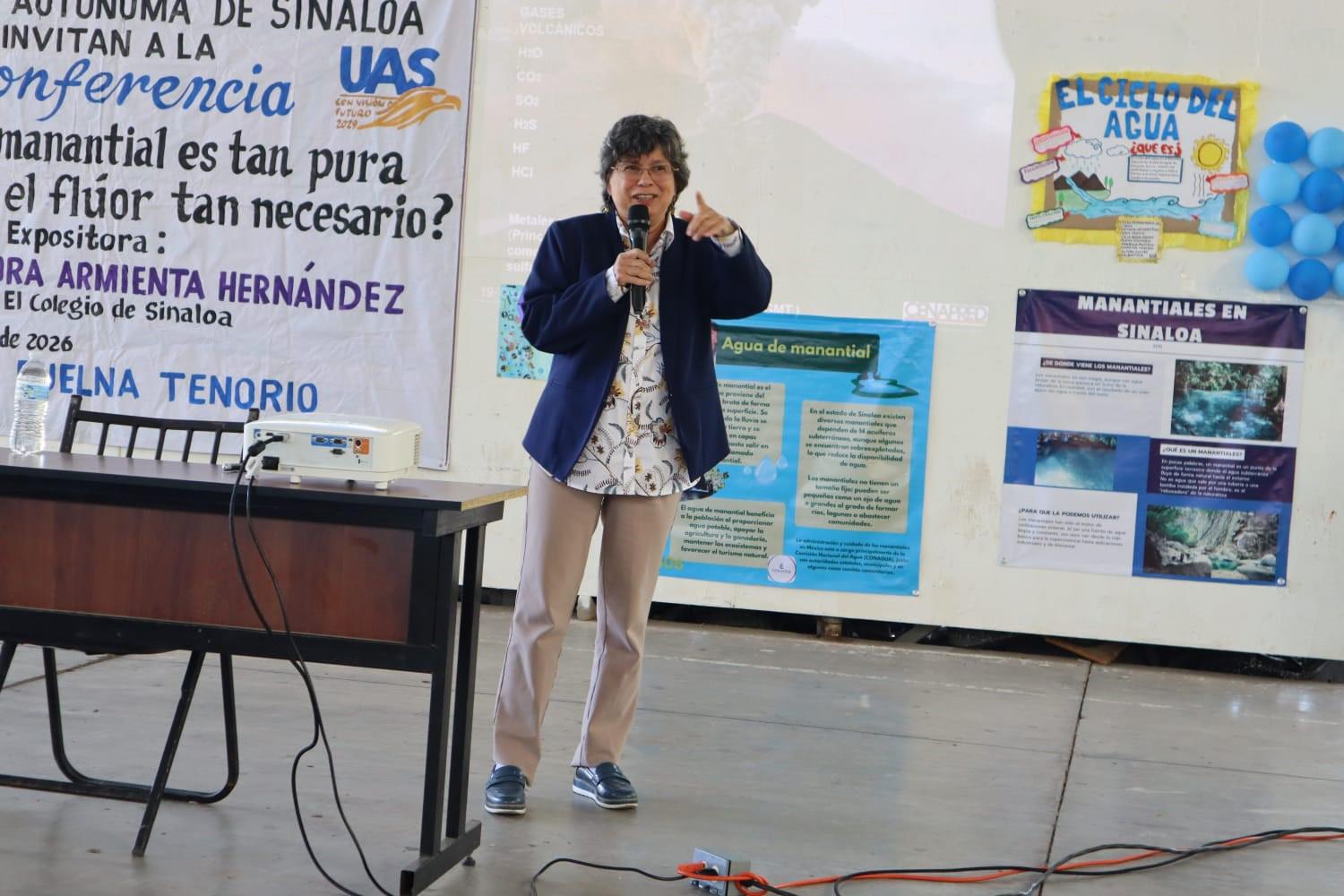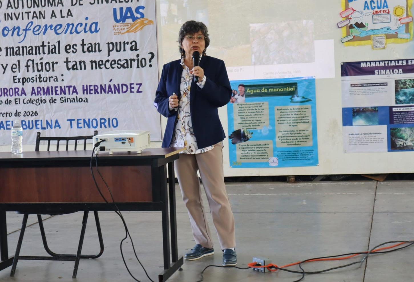“No hay que creer tanto lo que dicen los medios sobre el agua ‘pura’ de manantial”, indicó la Dra. María Aurora Armienta Hernández —miembro de El Colegio de Sinaloa— durante su conferencia ¿El agua de manantial es tan pura como dicen y el flúor tan necesario?, impartida a estudiantes de la preparatoria “Rafael Buelna Tenorio” de la Universidad Autónoma de Sinaloa, el viernes 20 de febrero del año en curso, contando con la presencia del Mtro. Juan Hinojosa Pardo, director del plantel educativo.