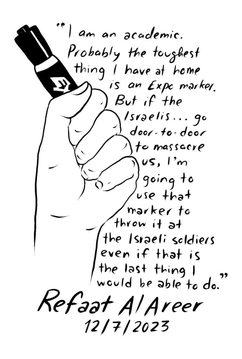 44-year-old Palestinian poet and academic Rafaat Al Areer was killed on December 6, 2023, along with six members of his family in an Israeli air strike on Gaza City. A book of his essays and poems, If I Must Die: Poetry and Prose, was published in 2024