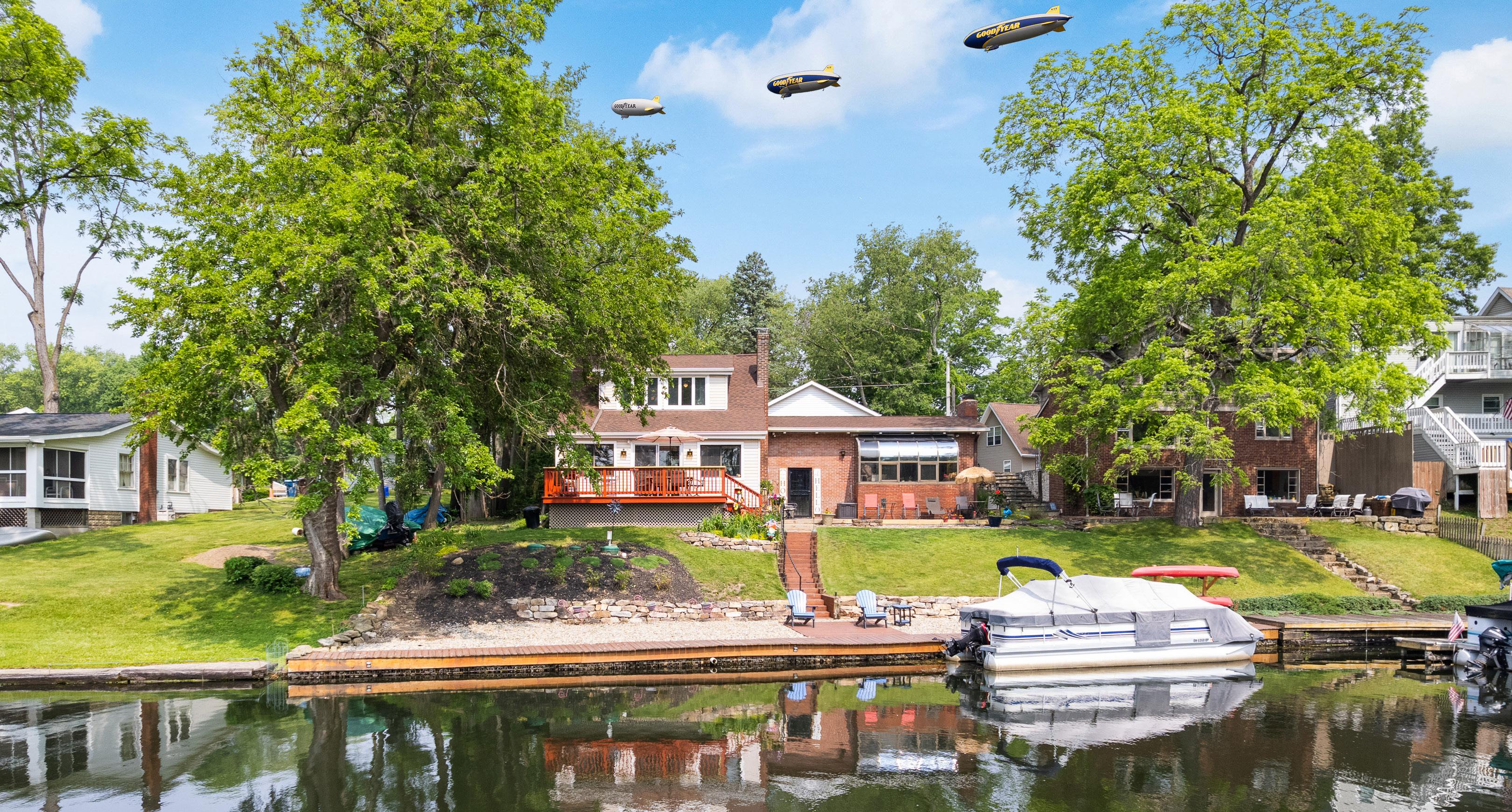 Better lake than never! Welcome to this charming Cape Cod home offering 80 feet of prime lake frontage on the Main Chain of Portage Lakes. Ideally located between West Reservoir and Turkeyfoot Lake, you’re right in the heart of all the lake activity. Situated on a generous lot with low-maintenance landscaping, the outdoor space is built for both enjoyment and entertaining. You’ll love the spacious deck, cozy patio, firepit area, and lakeside parking for up to three boats. A new two-car garage was added in 2020, with plenty of additional guest parking. Inside, the home offers 3 bedrooms, 3 full bathrooms, and 3 fireplaces that add comfort and charm throughout. The kitchen features Corian countertops, stainless steel appliances, ample cabinetry, and beamed ceilings, plus a new dishwasher installed in 2025. The beamed ceilings continue into the dining and living areas, where a full-wall brick fireplace and an indoor greenhouse atrium create a unique and inviting space. A warm family room with another fireplace leads to a sunroom with lake views and direct deck access. A second main-level master suite adds convenience. Upstairs are two additional bedrooms and a full bath. The finished lower level offers a