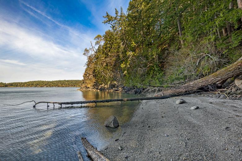 Wake up to sweeping waterfront views stretching east toward Mt. Baker, Orcas Island, Yellow Island, and the serene passage of Wasp Pass. This sunny beach lot offers a rare combination of natural beauty and practical advantages protected from prevailing winds and stairs down to a long stretch of walkable pebble beach. The land is partially cleared, level, and accented with mature, majestic trees, providing both privacy and character. A paid water hook-up is already in place, making it easier to envision your dream retreat taking shape in this stunning, peaceful setting.