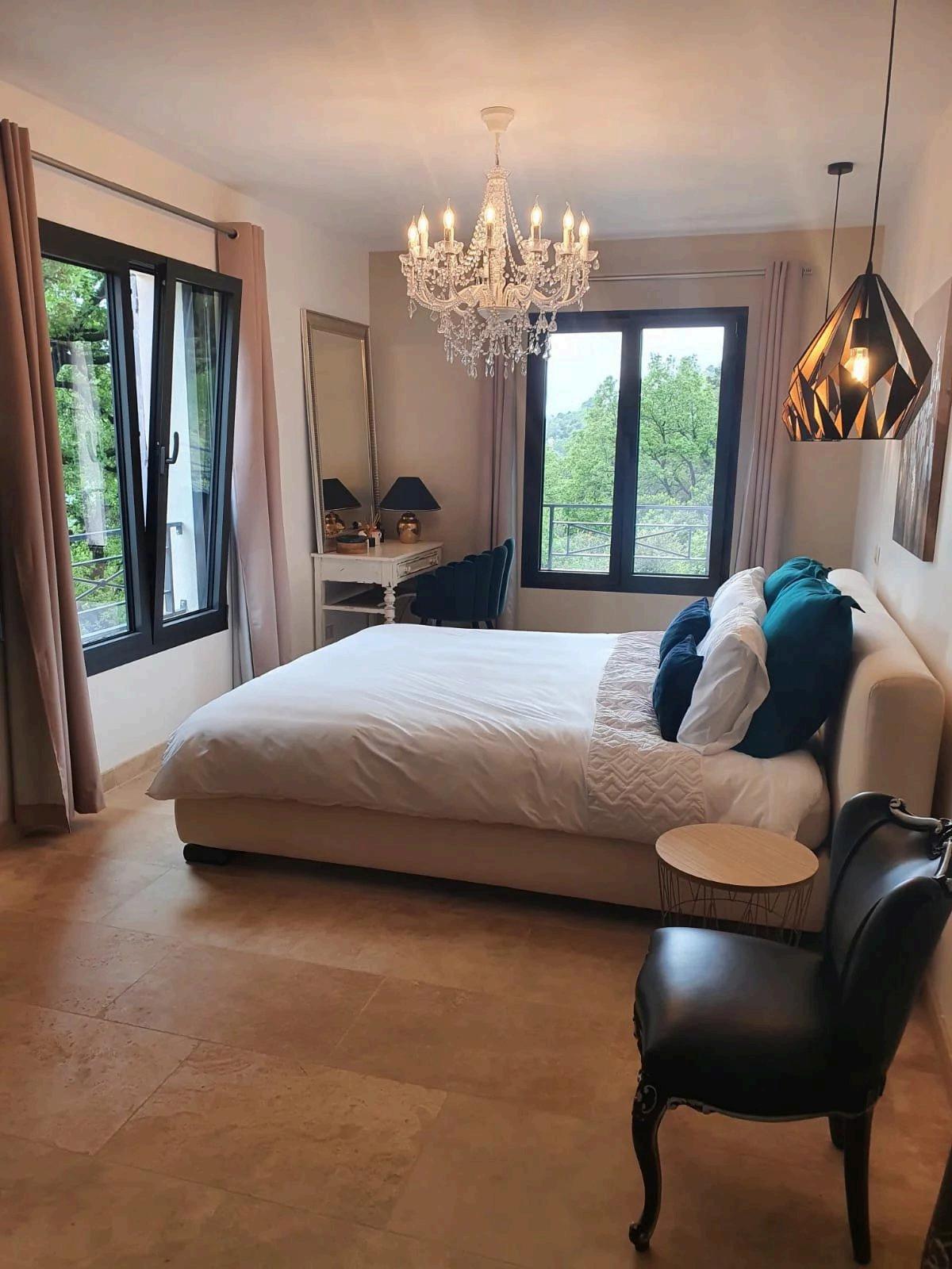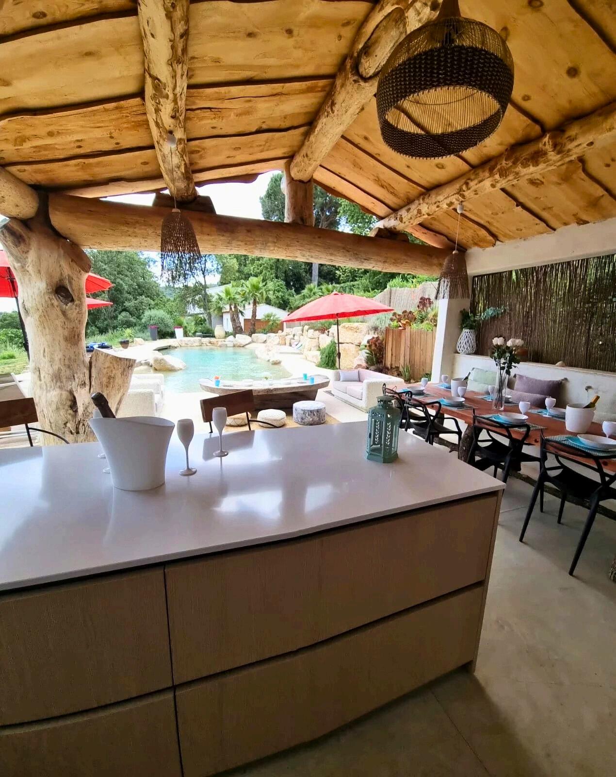 Dès l’entrée, le hall dévoile un espace de réception baigné de lumière : vaste séjour avec cheminée, et cuisine au design singulier, pensée en open space avec bar, prolongée par une arrière-cuisine attenante.
