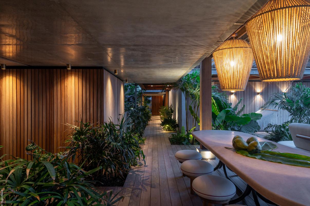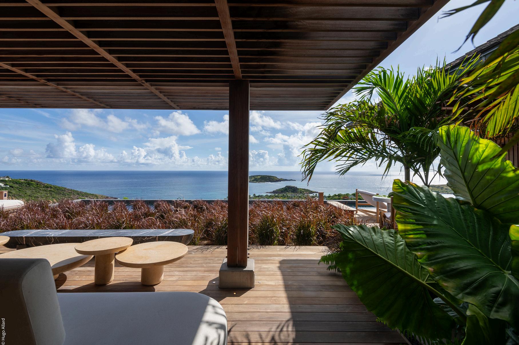 La salle à manger, sous ses structures en bois sculptural, s’ouvre sur l’océan comme un tableau vivant.