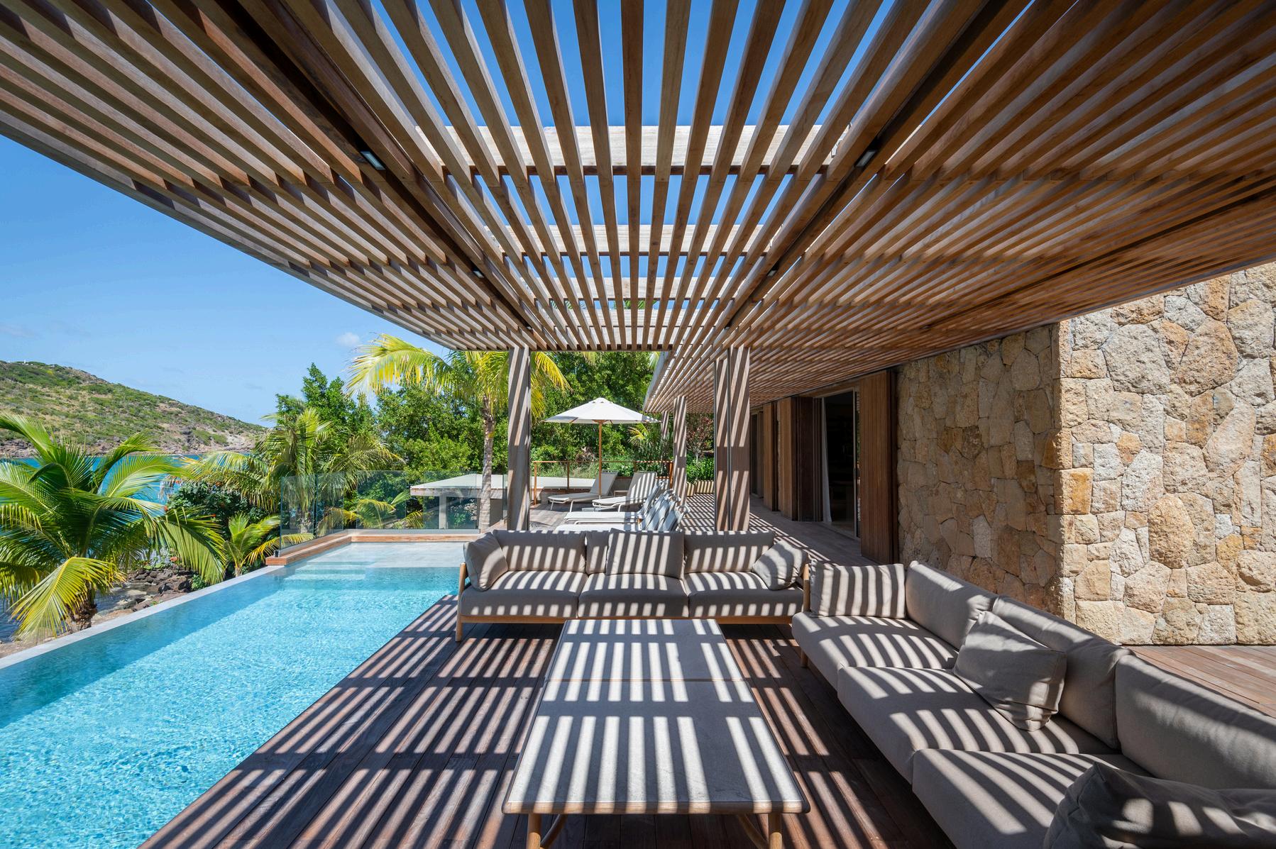 La terrasse principale s'étend en continuité avec le salon et l'espace de vie, offrant une transition en douceur entre l'intérieur raffiné de la villa et l'environnement naturel de Marigot. Bordé de bois nobles et subtilement ombragé par une élégante pergola, il accueille divers espaces de détente, de repas et de contemplation. Conçu comme une extension naturelle de l'architecture, il vous invite à vivre chaque instant au rythme de la lumière et de la mer.