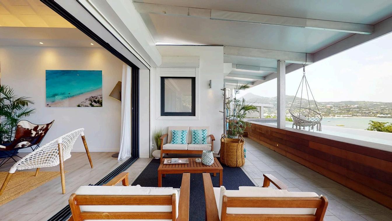 Le séjour est lumineux et accueillant, avec une partie salle à manger et une cuisine américaine équipée. Deux chambres profitent d'une magnifique vue sur la mer et le lagon de Grand Cul de sac, tandis qu'une troisième chambre dispose d'une terrasse agréable. Trois salles d'eau apportent confort et praticité.