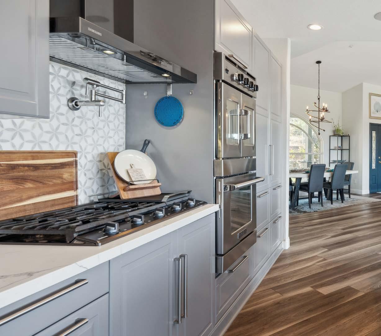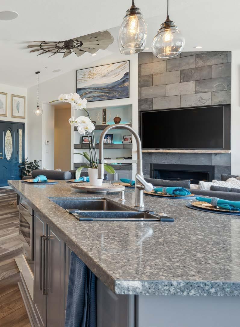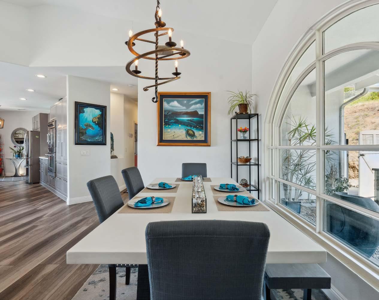 The heart of the home is the fully remodeled chef’s kitchen, featuring a large center island, custom cabinetry, sleek countertops, and top-tier appliances. The design encourages connection—with sight lines that extend into the family room, dining area, and beyond to the backyard’s sweeping views.