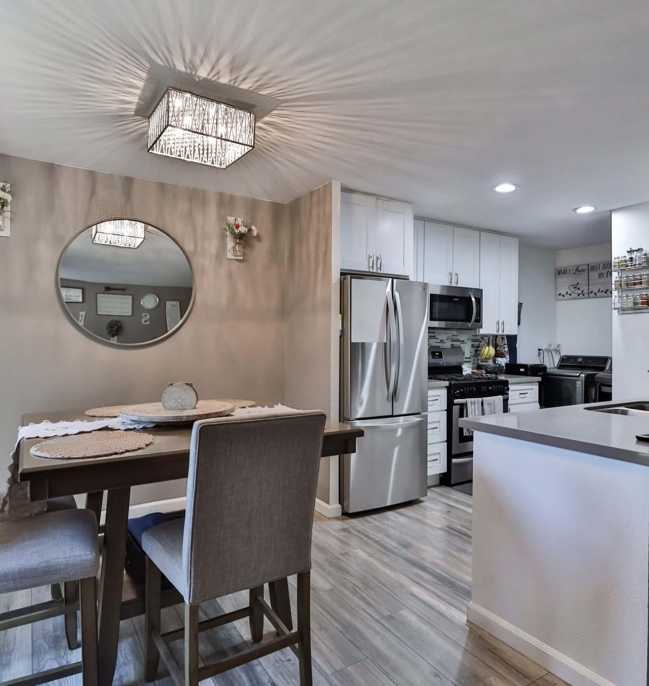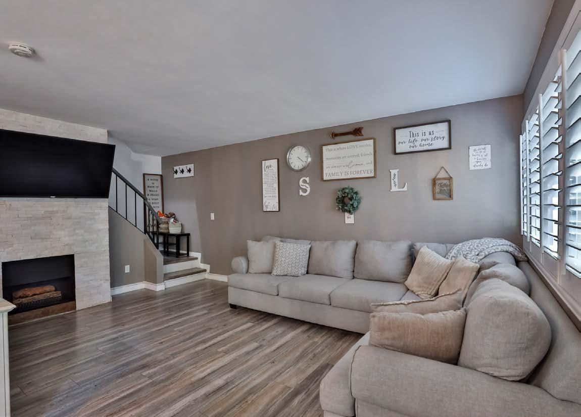 Beautiful Condo, with two bedrooms, and 1.5 bathrooms. The kitchen features laminate flooring, quartz countertops, stainless steel appliances, custom cabinets, and a lovely backsplash tile. Additional home features double pane windows and sliding doors, plantation shutters, and a floor-to-ceiling stone fireplace. A half bathroom is found on the first level. Indoor laundry (washer & dryer included). Private fenced patio with security door and turf grass. One car garage & one assigned parking space. Enjoy the community pool. Close to schools, shopping, restaurant, and freeway access.