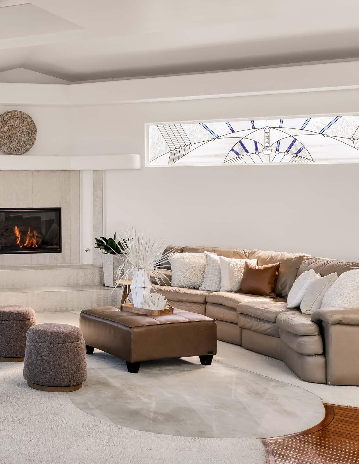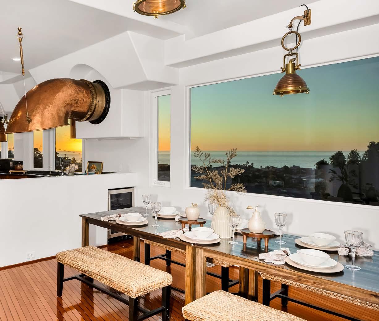 This architectural masterpiece is rich in high-end custom finishes, including a repurposed bronze channel marker buoy transformed into a dramatic light fixture above the main stairwell, along with accents of copper, brass, bronze, stainless steel, and teak. Highlights include a custom bar in the downstairs living room, exceptional outdoor living spaces, and a rooftop deck with a jacuzzi offering breathtaking 360-degree ocean-to-mountain views. Upstairs, the open and airy floor plan is filled with natural light and features an unforgettable gourmet kitchen with a repurposed copper smokestack from a decommissioned naval ship as the stovetop hood, custom solid teak cabinetry, repurposed teak yachtdeck flooring, a new 24-bottle wine cooler, and a dining and family room with mesmerizing ocean views.