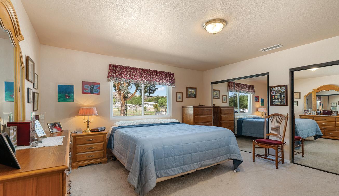 and the en-suite has dual sinks and a spacious shower. Both remaining bedrooms are spacious & have mirrored wardrobe doors. 2 car attached garage as well as an open ended 30x20 shed. Rear patio is covered, great for entertaining and relaxing. Property is fenced with automatic gate entry, flat and usable 2.43 acres. Close to town yet very private neighborhood. Owned solar to keep costs low!