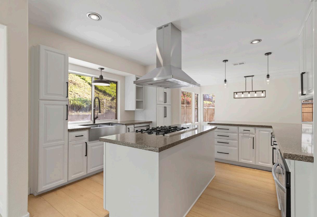 kitchen featuring granite countertops, stainless steel appliances, a farmhouse sink, and an inviting bar. The home’s open and airy circular layout leads naturally into the family room, showcasing newly installed laminate floors and a statement fireplace—perfect for relaxing or entertaining. Upstairs, four bedrooms and an open loft (could be converted to a 5th bedroom easily) provide flexible living space, all refreshed with new paint. Owned solar panels enhance efficiency while adding long-term savings. This is refined Eastlake living at its best.