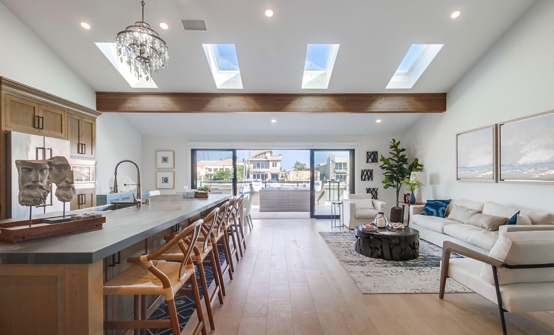 Experience unparalleled coastal luxury with this impeccably remodeled single-level home in the exclusive Coronado Cays. Boasting a bright, openconcept design, this coastal contemporary residence features four skylights in the great room, infusing the space with abundant natural light. The entertainer’s gourmet kitchen is a true showpiece, with a central island, Dekton countertops, and high-end KitchenAid appliances—including a wine fridge, refrigerator, 6-burner gas range, microwave, and dishwasher— creating an ideal setting for sophisticated gatherings. Inside, the thoughtfully designed layout offers refined touches throughout, including a private office, a luxurious primary suite with an en-suite bath, and a versatile second bedroom. Beautiful chandeliers grace the kitchen and dining areas, adding elegance, while hardwood floors and premium finishes enhance the home’s timeless appeal. Cleverly concealed barn doors reveal both the office and a laundry area with a
