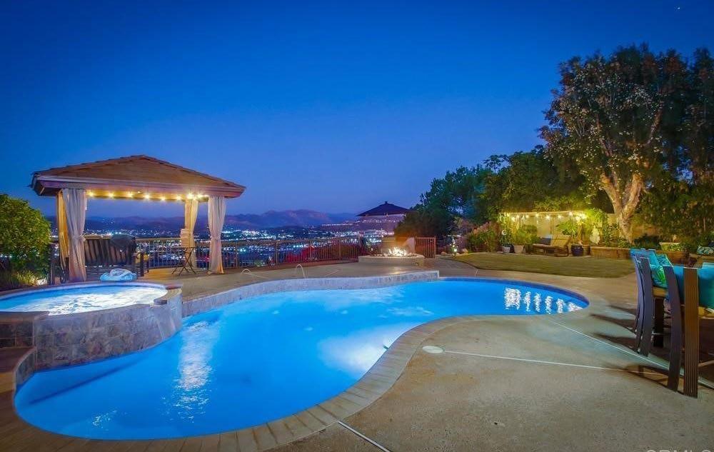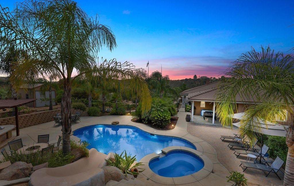 and gourmet kitchen with large dining nook, large center island, and walk-in pantry with custom wrought-iron door. The gorgeous backyard features a pool/spa and waterfall, large outdoor kitchen and BBQ, and covered seating area. This home sits on a large 11,762-square-foot lot. The upstairs has 4 bedrooms and 3 baths. Enjoy the huge primary suite with double-door entry, large private balcony, corner fireplace, custom double vanity, and large walk-in with organizers. No HOA or Mello-Roos. This home is located in one of the nicest neighborhoods in Rancho Del Rey.