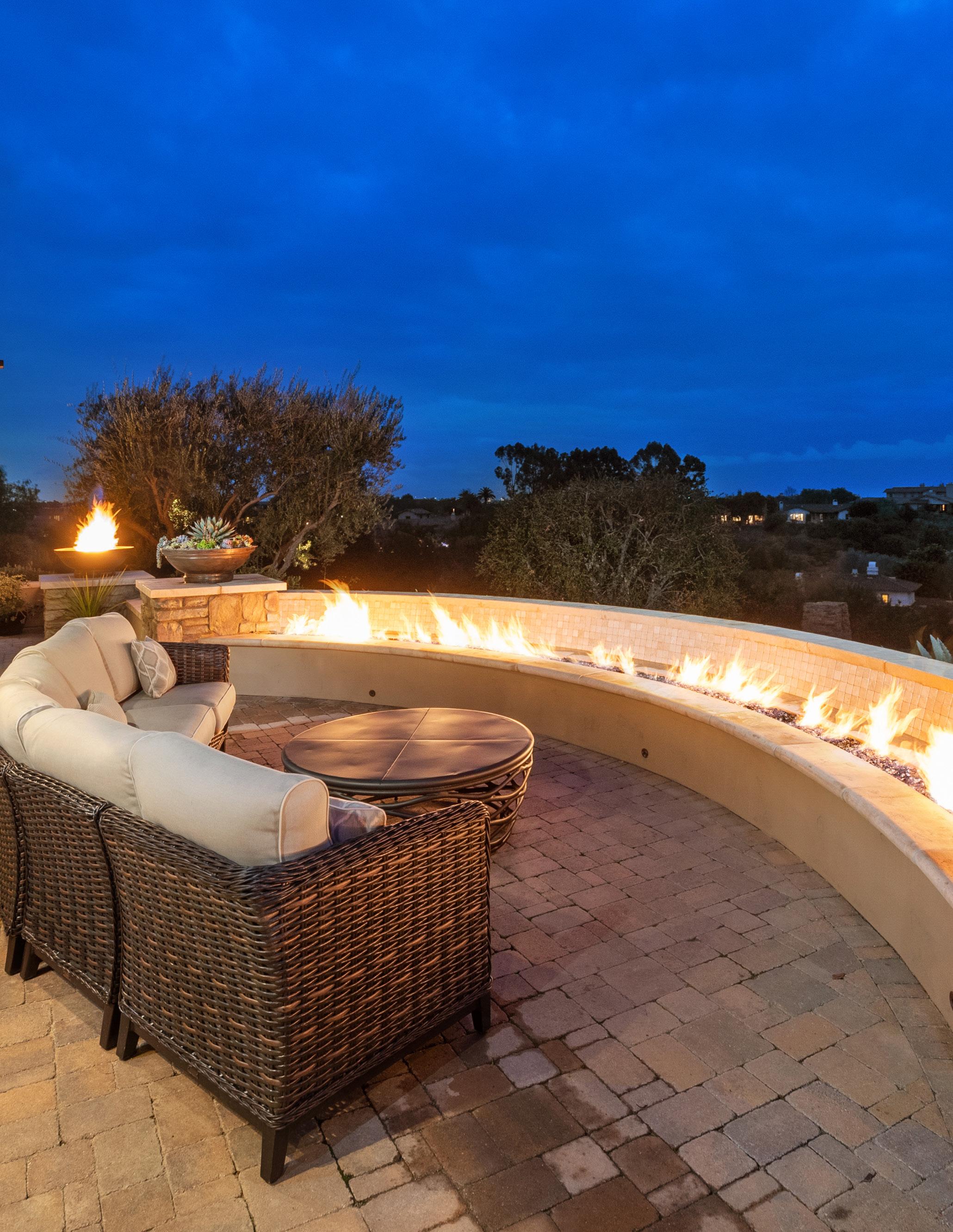 Santaluz single-story custom home with rare double ocean and golf course views! Wake up to an amazing sunrise view of hole #7 with Black Mountain as a backdrop. Later in the day, stay warm in front of a fire wall and watch hot air balloons and a beautiful sunset ocean view! Architect Scott Grunst designed this updated Tuscan home with 3 en-suite bedrooms, state-of-theart theater, and a multipurpose casita. The movie theater can be converted into a bedroom as well.
