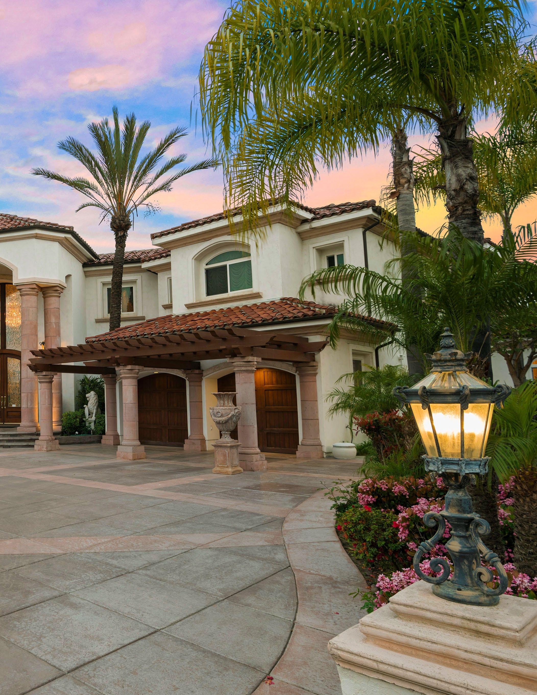Exquisite custom home in the wonderful community of Rancho del Rey. Original owner; real pride of ownership is evident. Enjoy 4 gorgeous fireplaces, 30-foot-high ceilings, upgrades throughout, and custom touches everywhere. The rare floorplan offers 2 downstairs bedrooms with walk-ins and baths ensuite, which can function as 2 additional primary bedrooms or a guest suite and office. Gorgeous wooden accents and custom wrought-iron railings can be found on staircases and even in the 5-car garage, which also includes epoxy flooring, custom doors, and custom lighting. Upstairs are 4 bedrooms, 4 full baths ensuite, and a 1/2 bath, while downstairs includes a huge powder room plus another powder room. The stunning upstairs primary bedroom features a large balcony, fireplace, and an opulent primary bathroom with dual sinks. The gourmet kitchen offers a professional range, extensive cabinetry, and granite countertops. Additional features include a huge laundry room, large pool room with leaded glass door, a beautiful bar area, and a lovely little indoor chapel. Outdoors, you’ll find a magnificent wrap-around yard, multiple fountains, a large lighted gazebo, an outdoor shower, an outdoor fireplace, and an orchard area. Low fees, low Mello-Roos.