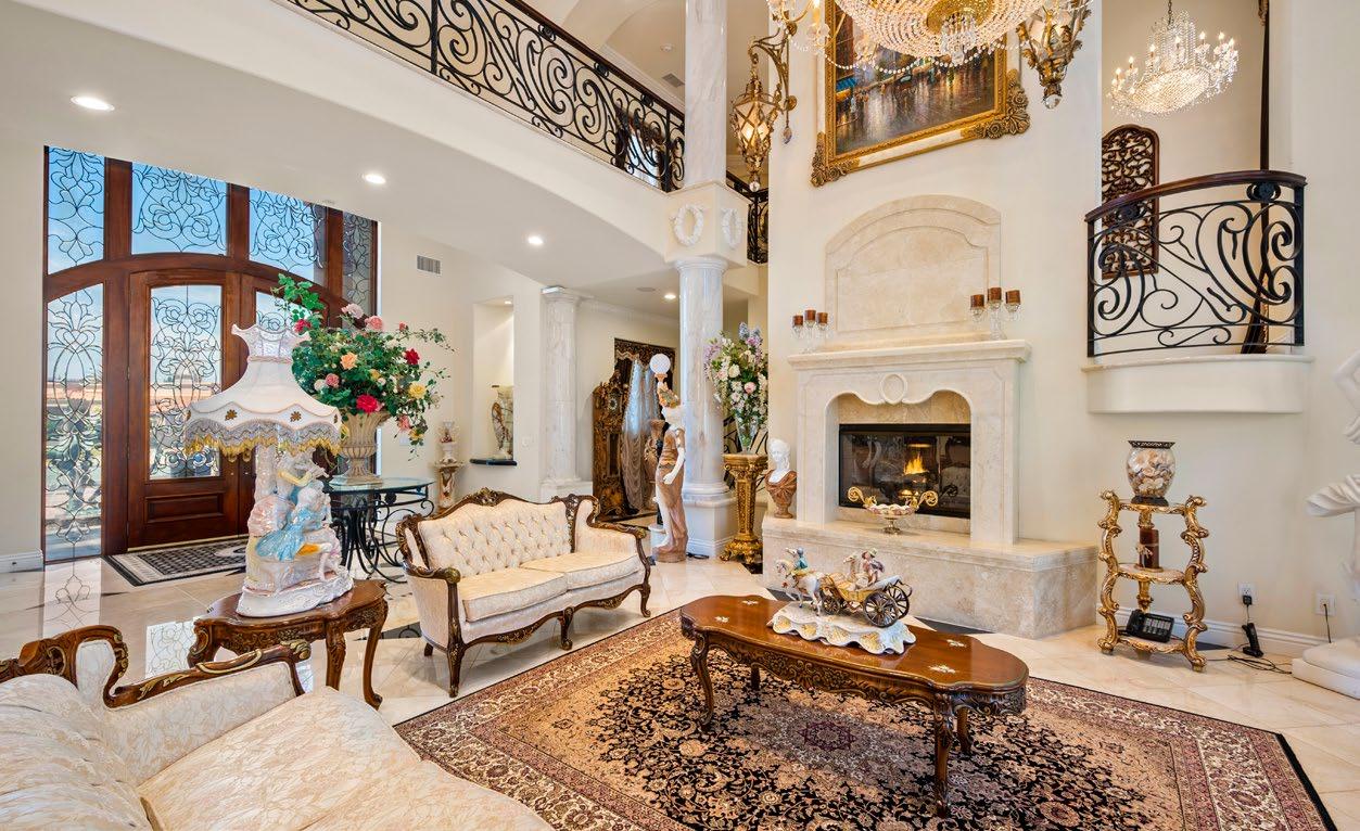 Exquisite custom home in the wonderful community of Rancho del Rey. Original owner; real pride of ownership is evident. Enjoy 4 gorgeous fireplaces, 30-foot-high ceilings, upgrades throughout, and custom touches everywhere. The rare floorplan offers 2 downstairs bedrooms with walk-ins and baths ensuite, which can function as 2 additional primary bedrooms or a guest suite and office. Gorgeous wooden accents and custom wrought-iron railings can be found on staircases and even in the 5-car garage, which also includes epoxy flooring, custom doors, and custom lighting. Upstairs are 4 bedrooms, 4 full baths ensuite, and a 1/2 bath, while downstairs includes a huge powder room plus another powder room. The stunning upstairs primary bedroom features a large balcony, fireplace, and an opulent primary bathroom with dual sinks. The gourmet kitchen offers a professional range, extensive cabinetry, and granite countertops. Additional features include a huge laundry room, large pool room with leaded glass door, a beautiful bar area, and a lovely little indoor chapel. Outdoors, you’ll find a magnificent wrap-around yard, multiple fountains, a large lighted gazebo, an outdoor shower, an outdoor fireplace, and an orchard area. Low fees, low Mello-Roos.