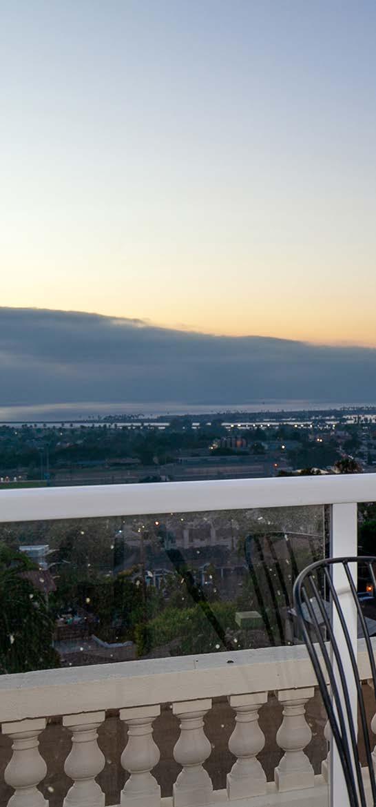 The second level is home to the primary retreat, complete with a dressing area, multiple closets, 2 Juliet balconies, and a fireplace. Additionally, this level features a game room with sweeping ocean views, a living area, a large patio overlooking the Coronado Bridge and Downtown, and 2 additional ensuite bedrooms with an office area.
