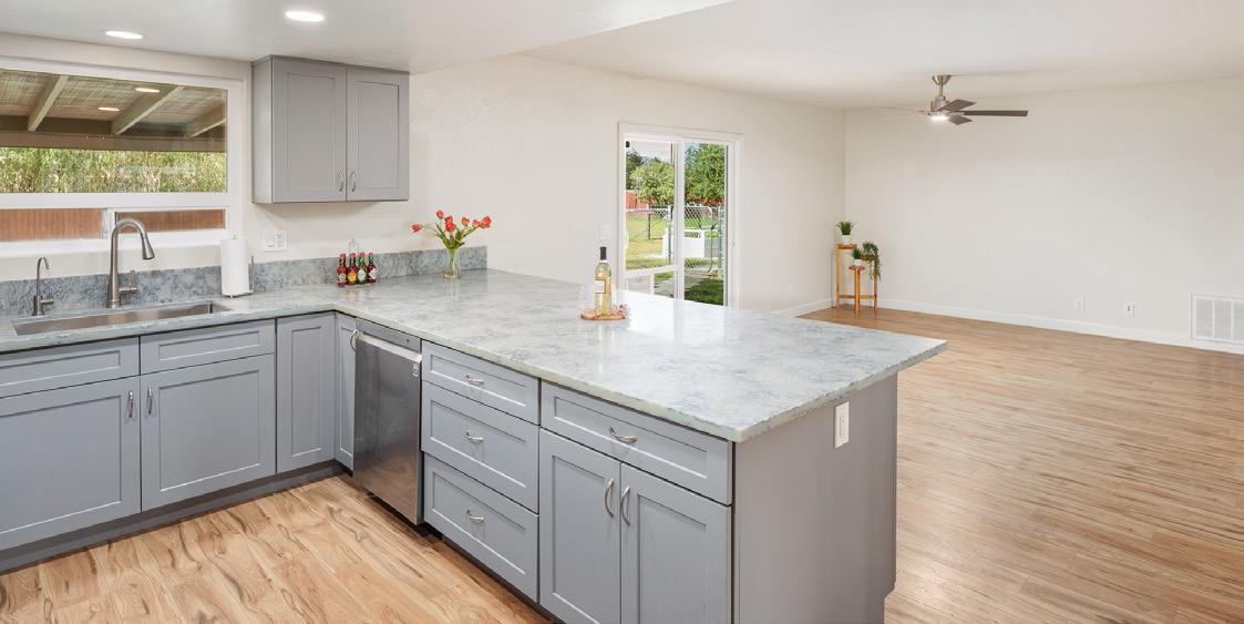 The updated kitchen features Bahia Blue quartz counters and shaker style cabinetry with stainless pulls. The breakfast bar is sizable adding storage & seating. Stainless LG appliances and recessed dimmable LED lighting illuminate. A reverse osmosis spout is present at the sink.