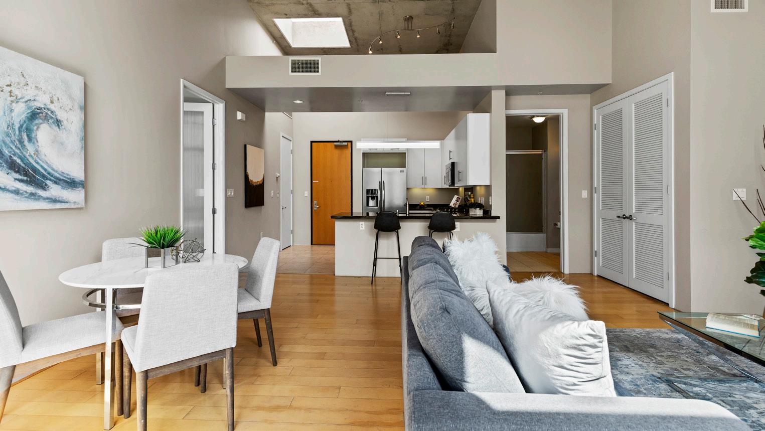 Experience luxury living in this immaculate, sun-drenched top-floor condo boasting west-facing views. This spacious one-bedroom, two-bathroom with optional second bedroom build out, loft-style residence features soaring 15-foot ceilings and a private balcony, offering the perfect blend of comfort and style. Step inside to discover a light-filled floor plan complemented by a beautiful kitchen complete with granite countertops and stainless steel appliances, including a gas cook-top. The elegance continues with hardwood and tile flooring, enhanced by multiple skylights and blackout shades for added ambiance and privacy. Convenience meets sophistication with included amenities such as an in-unit washer/dryer, ceiling fans, central air and heat and large primary en-suite bathroom with dual sinks and walk in closet. This unit also comes with two parking spots (tandem), an electric car charger, and a rare oversized private storeroom for your convenience. M2i residents enjoy a host of amenities, including low HOA dues, a fully equipped gym, a BBQ area/community deck, two lobbies, and a serene courtyard perfect for relaxation or entertaining. Don’t miss out on this exceptional opportunity for upscale urban living!
