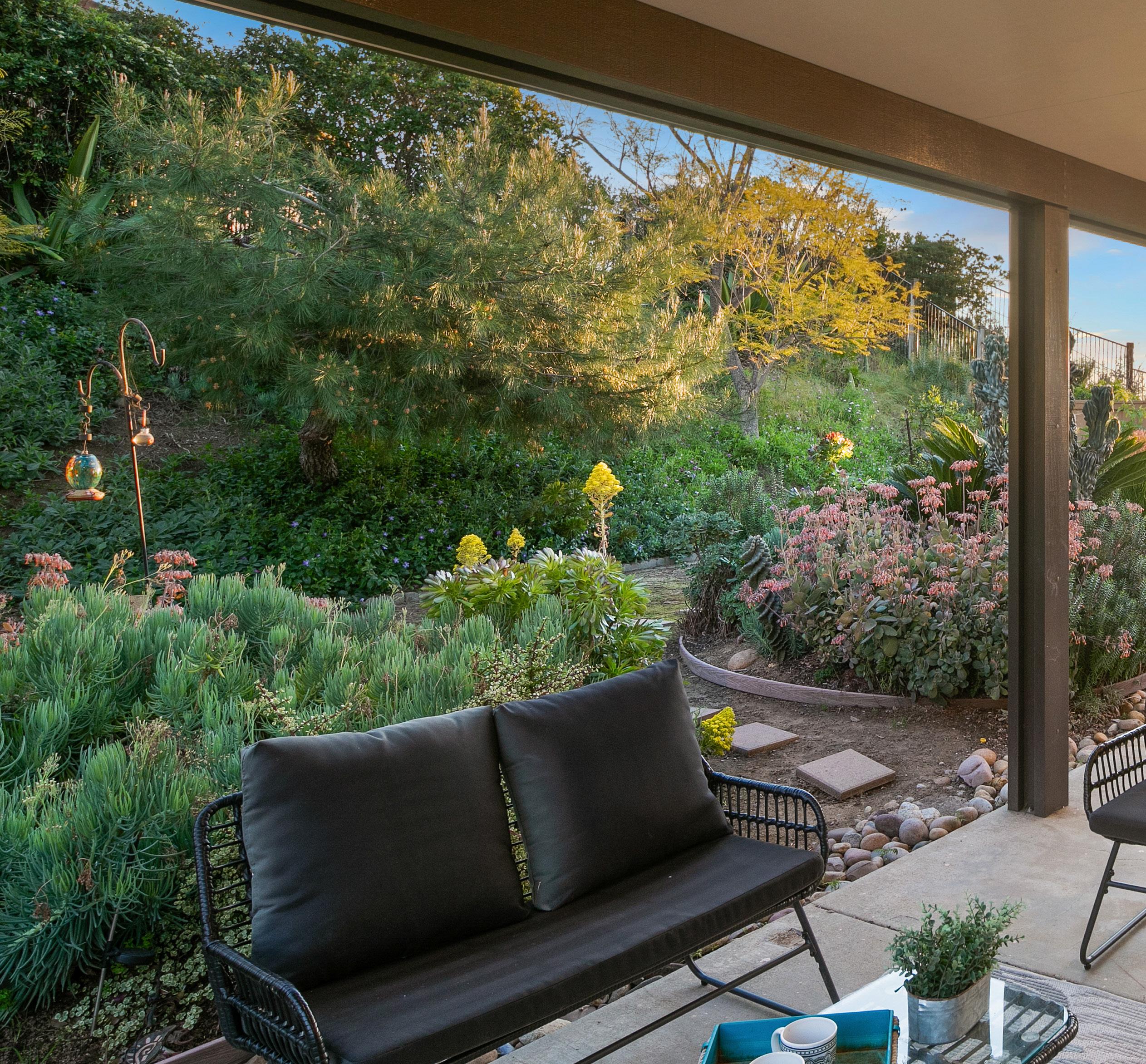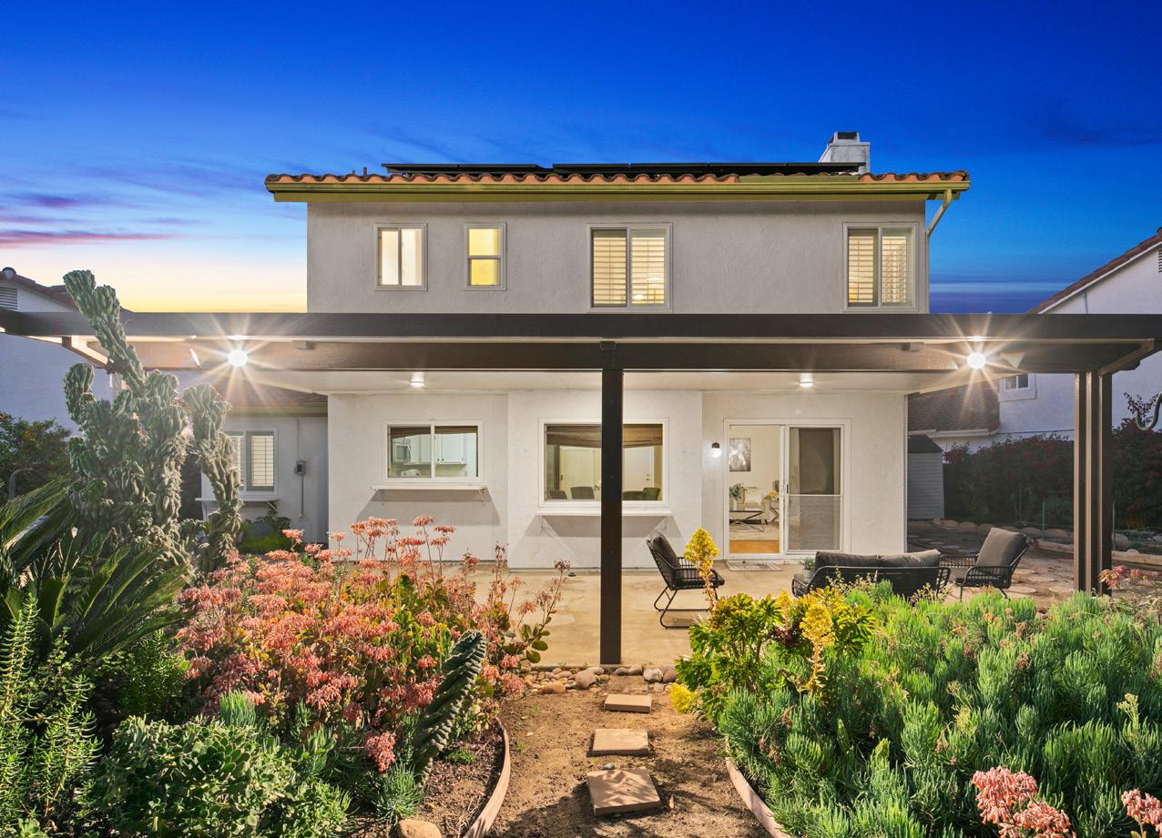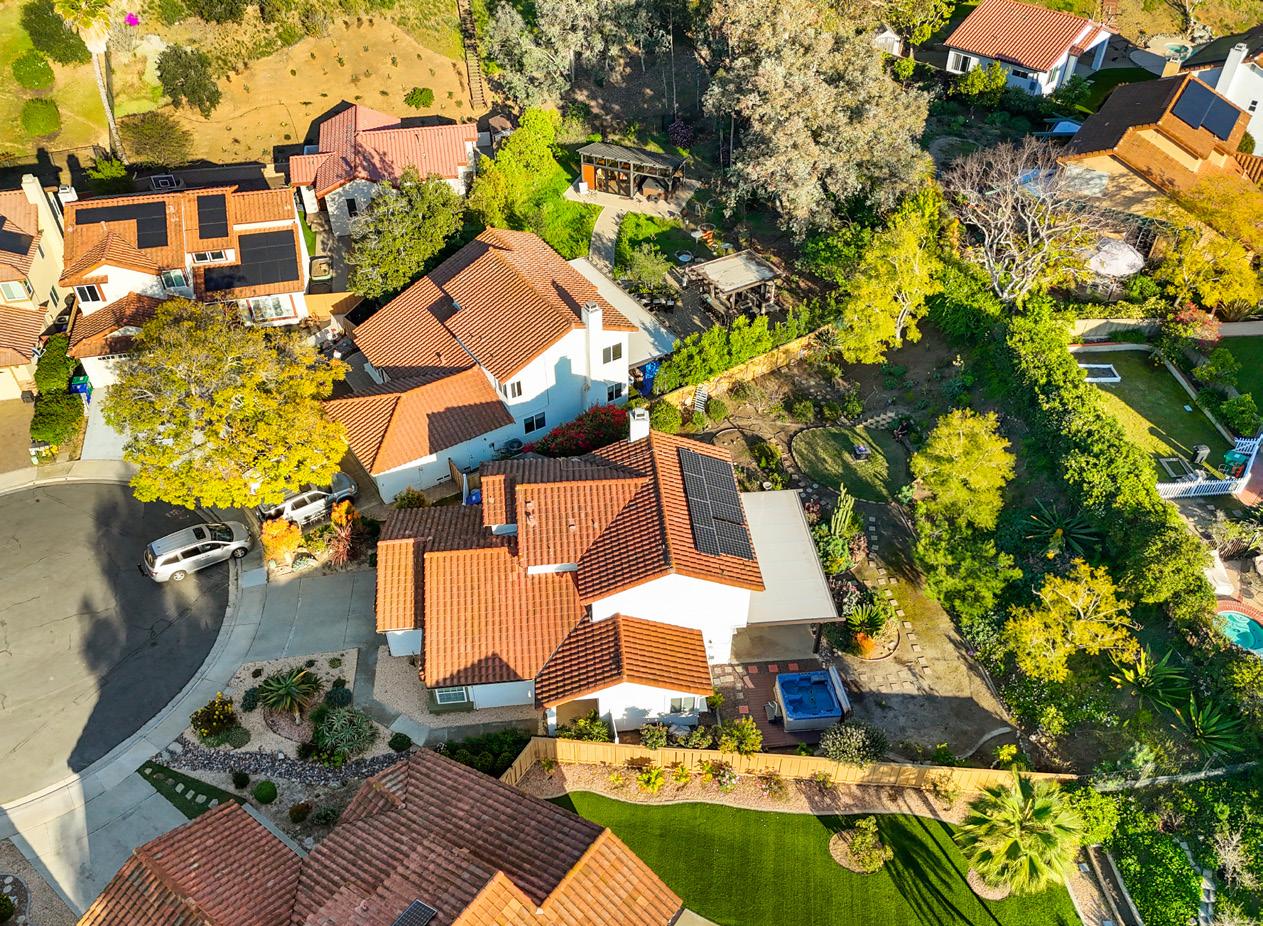 Ideally positioned in the serene hills of Sabre Springs and tucked at the end of a peaceful cul-de-sac within the award-winning Poway Unified School District, this beautifully updated residence rests on an expansive pie-shaped, fully usable 0.22 acre lot. Striking curb appeal begins with a vibrant and mature succulent garden that creates a warm and inviting first impression. Inside, soaring ceilings and an abundance of natural light enhance the spacious living room, which flows effortlessly into the adjacent dining area—perfect for both elegant entertaining and everyday living. The designer kitchen has been thoughtfully updated with custom cabinetry, sleek countertops, stainless-steel appliances, gas cooking, and a sunny breakfast nook, all opening seamlessly to a welcoming family room centered around a contemporary brick fireplace. Upstairs, the generous primary suite offers a tranquil retreat with two spacious wardrobe closets and a beautifully refreshed ensuite bath. Two additional bedrooms and a well-appointed secondary bathroom complete the upper level, while a convenient fourth bedroom and full bath on the main floor provide exceptional flexibility for guests, a home office, or private fitness space. Outside, the thoughtfully curated, waterwise backyard unfolds like a private garden sanctuary, with whimsical meandering pathways leading to a variety of charming outdoor vignettes. Entertain beneath the pergola or covered patio, relax in the covered spa, or enjoy the multiple garden areas designed for peaceful moments outdoors. Additional highlights include OWNED solar, central air conditioning, dual-pane windows, fresh interior paint, new carpeting, and generous storage plus attached two-car garage. Ideally located near Sabre Springs Park, scenic open-space trails for hiking and biking, and just minutes from shopping, dining, and freeway access, this exceptional home offers the perfect balance of privacy, beauty, and everyday convenience.